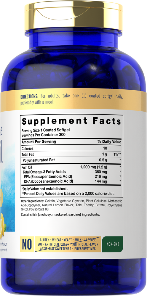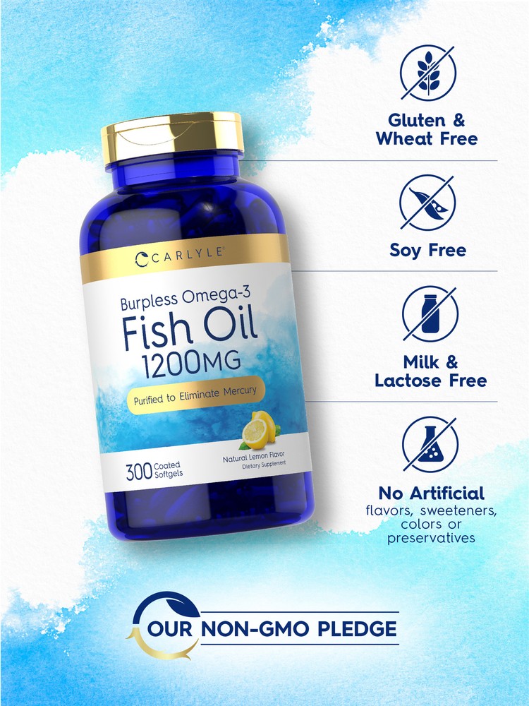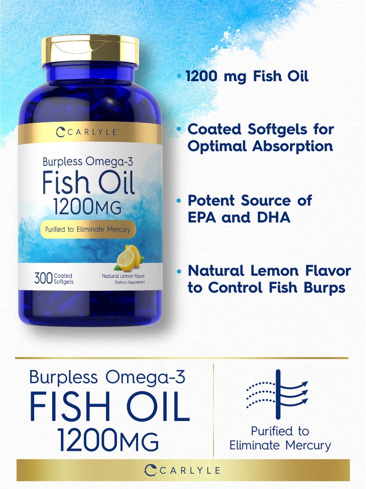 Supplementing with Fish Oil: Research shows that a diet containing an abundance of fatty fish can have many nutritional benefits. This is because oil from fish contains beneficial, naturally occurring Omega-3 essential fatty acids EPA and DHA. Fish oil now comes in forms such as capsules, pills, liquid, gummies and tablets, and is recommended for men and women looking to supplement a strong diet. Carlyle Burpless Omega-3 Fish Oil: Get the nutritional benefits of Fish Oil with our Burpless Omega-3 Fish Oil! This high potency formula provides 3,600 mg of Fish Oil per serving and is purified to eliminate mercury and ensure high quality. Coated softgels are designed for burp-free satisfaction, made with natural lemon flavor for you to enjoy! Support your routine with our 300-count supply! Rooted in Wellness: Our expertise in sourcing the purest ingredients combined with advanced technologies makes us proud to deliver premium, honest supplements at the best value. Carlyle Burpless Omega-3 Fish Oil is a testament to our commitment to excellence, made with powerful ingredients rooted in wellness. Thanks for choosing us in your pursuit of living healthy.