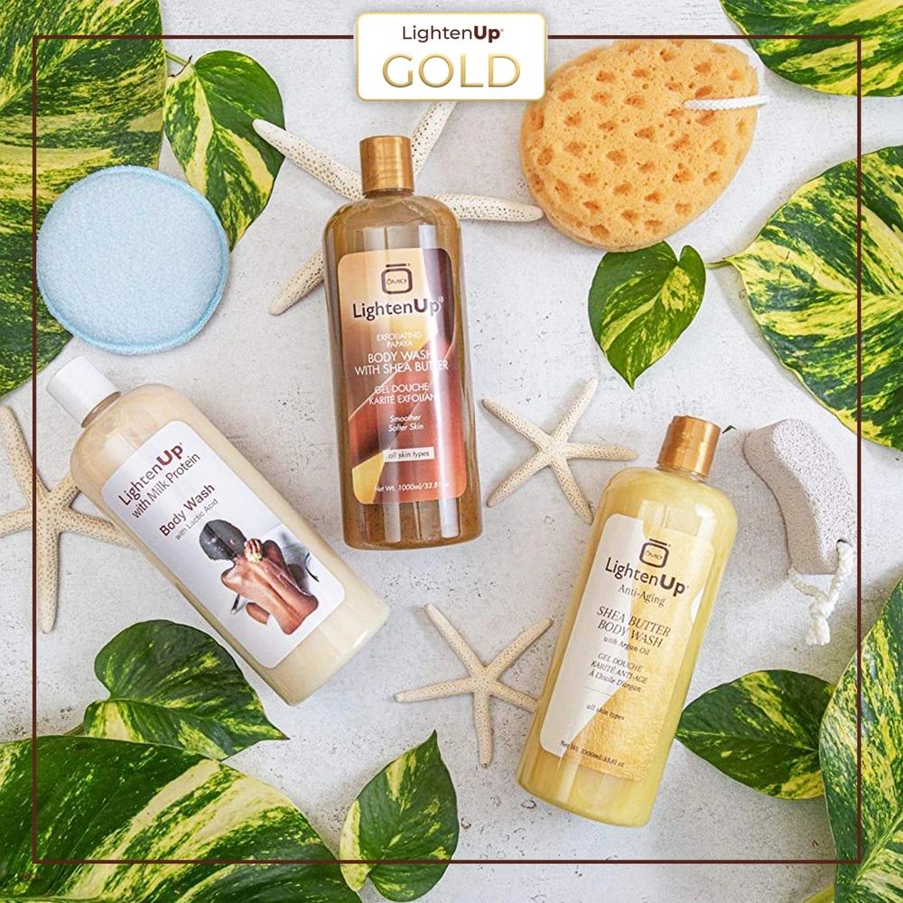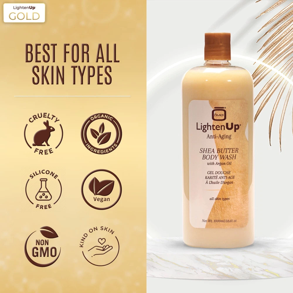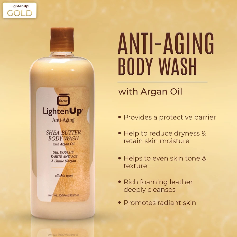 ANTI AGING FORMULA Reawaken your senses and boost skin’s energy with LightenUp Anti-Aging Nourishing Shea Butter Body Wash. ARGAN OIL : It is a E- and fatty acid-loaded oil derived from trees native to Morocco, and it poses a bunch of benefits for hair and skin. When applied to your body, argan oil may help protect against sun damage, hydrate skin, reduce signs of aging, and even help control oily skin SHEA BUTTER : High concentrations of fatty acids and vitamins make this shower an ideal product for softening . Using shea butter on your body, especially your face, can condition, tone, and soothe your skin. MAXIMISE THE BENEFITS: Apply daily by massaging all over the body during your shower. To avoid further pigmentation, always up with our SkinProtect SPF 50 Sunscreen daily during and after brightening treatment.