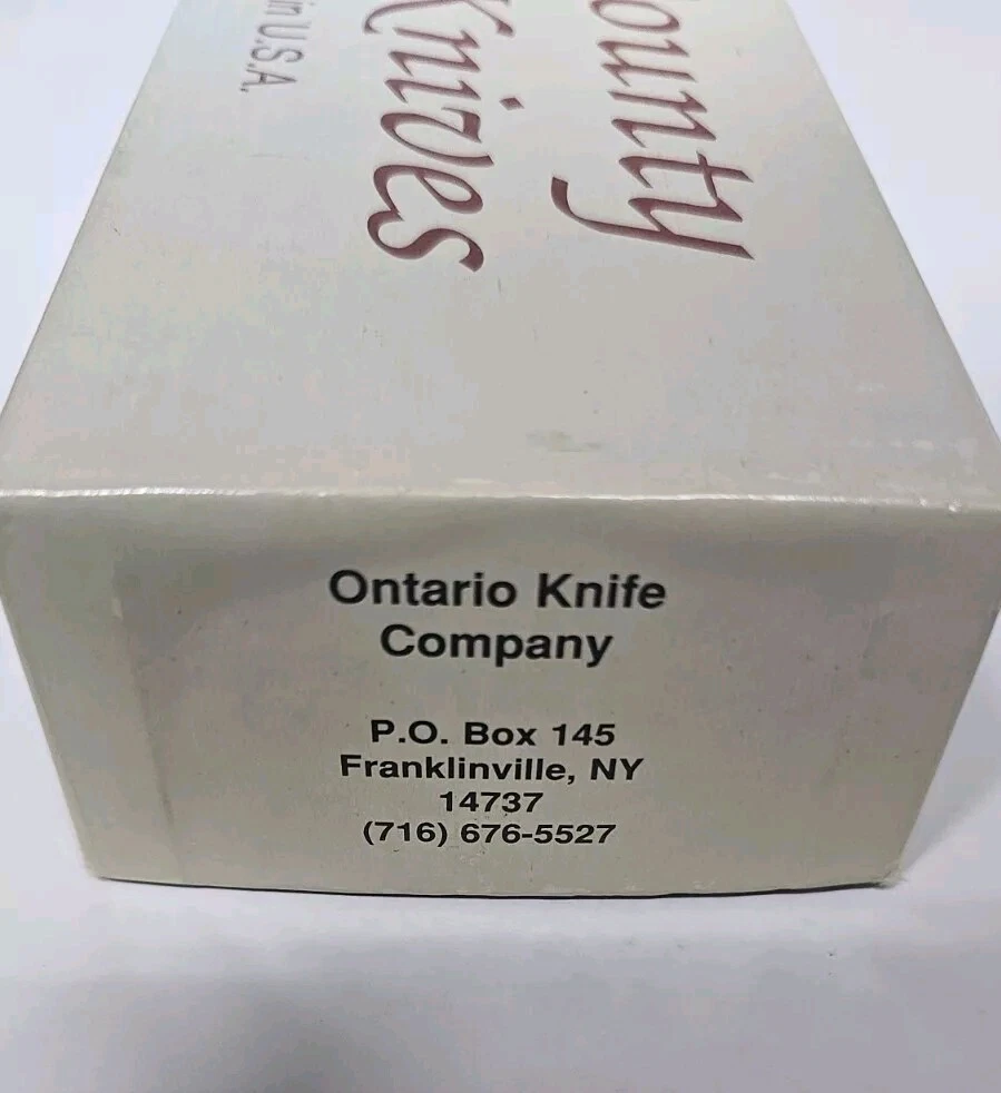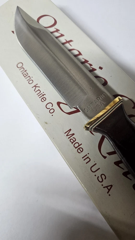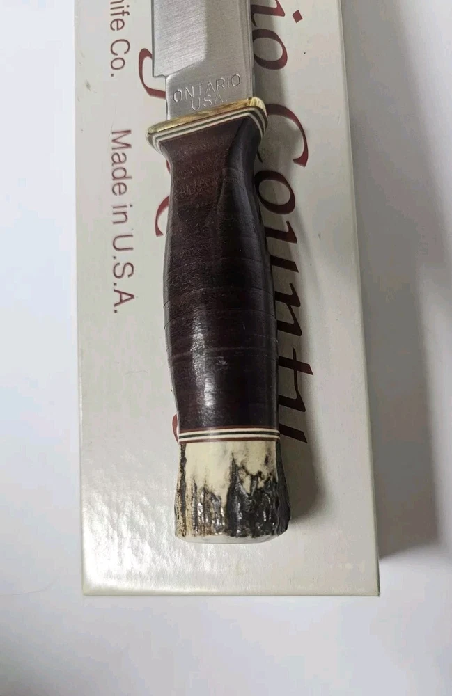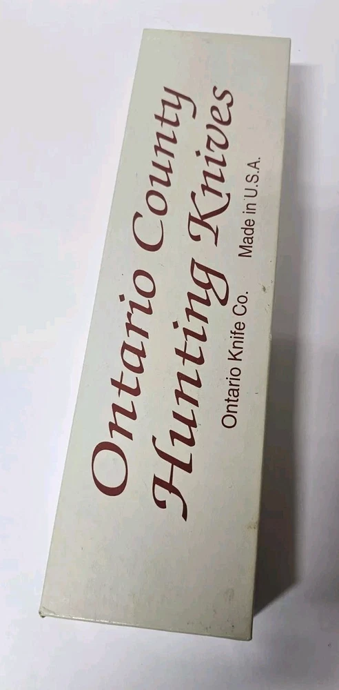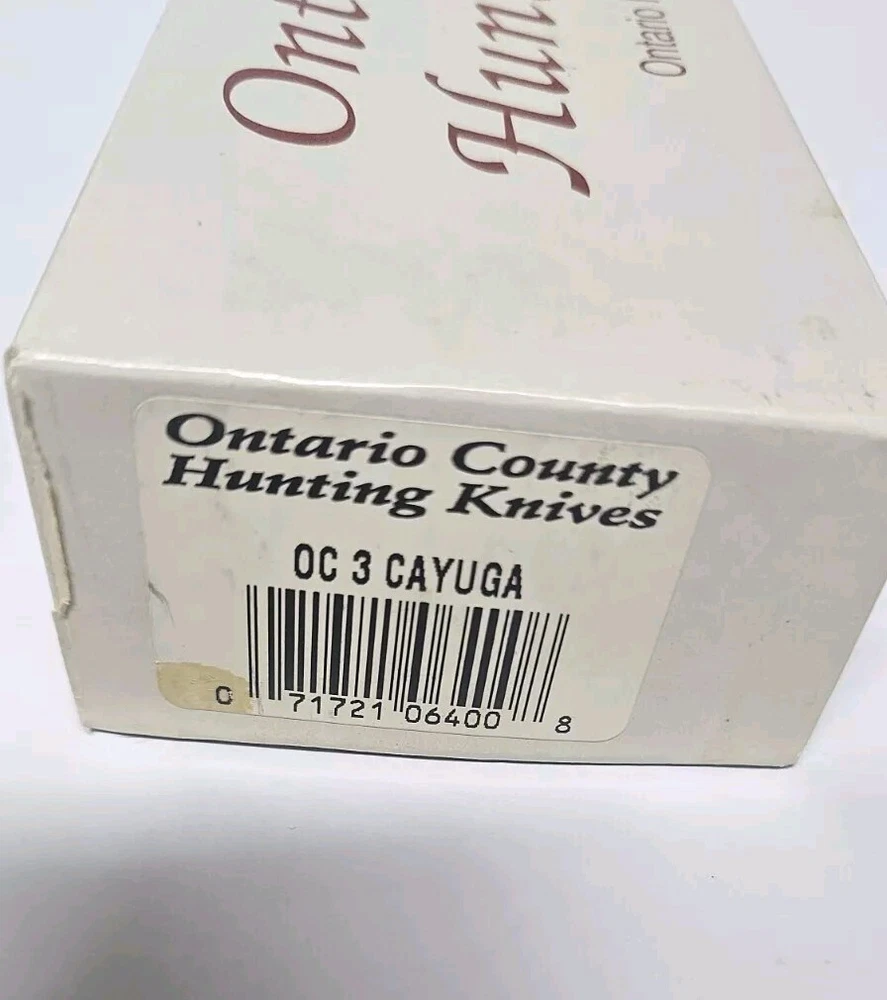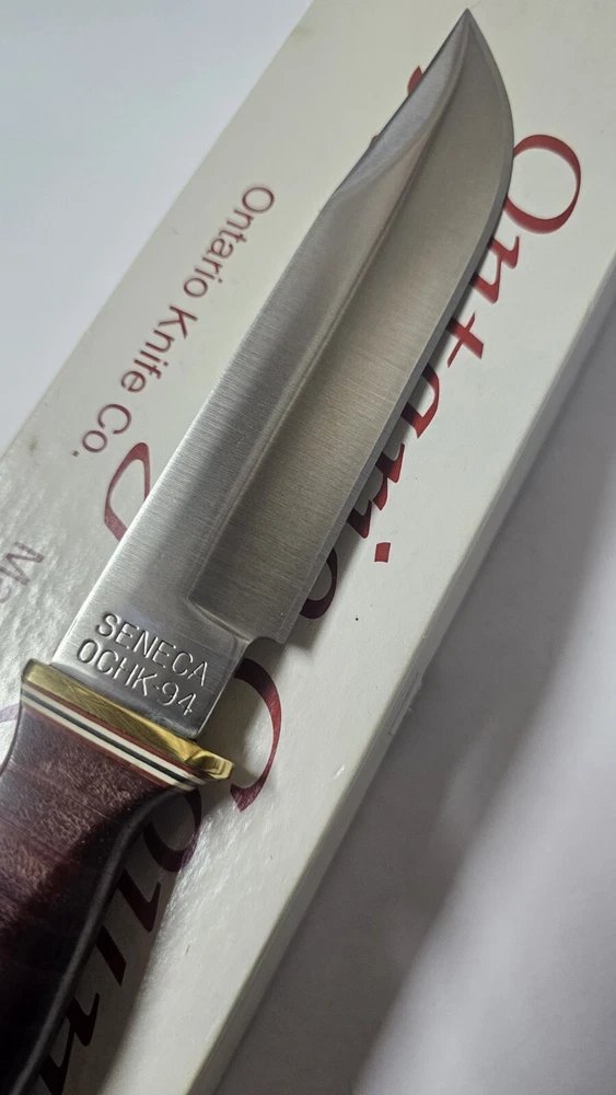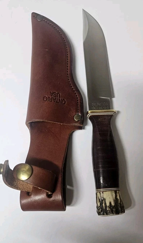 Ontario fixed blade knife Model Seneca OCHK-94 Cayuga Around 10½ overall 6" blade Razor sharp Never used carried or sharpened Leather with stag pommel Comes with original box Comes with sheath but seems like it's for the smaller model Please look at the photos carefully to see what you are getting. No refunds sorry and thanks for looking.