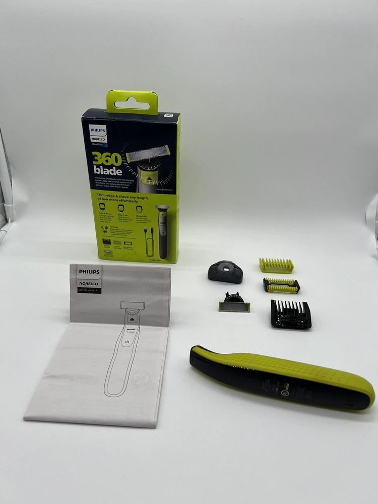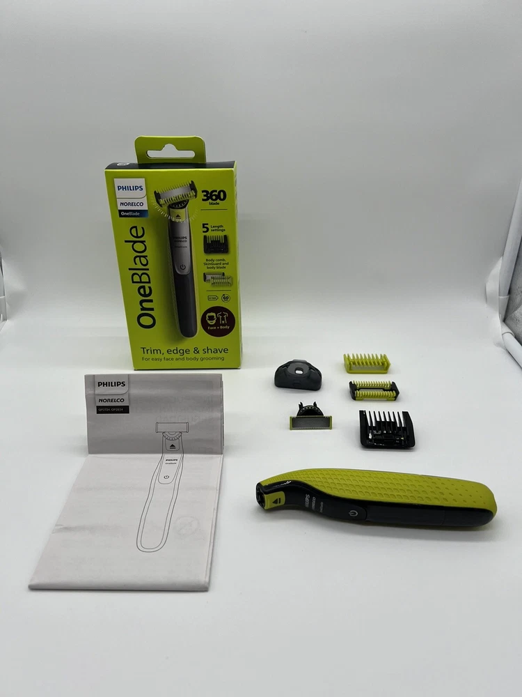 One Blade. philips Norelco 360blade 5length settings Open Box, missing charger. Item: S2(6) Rechargeable OneBlade 360 Face plus Body can trim, edge, and shave any length of hair. Shave is not too close so your skin stays comfortable. The innovative 360 Blade can flex in all directions to adjust to the curves of your face. The design enables constant skin contact and control. Includes 2 blades, 1 360 blade for your face and 1 blade for your body. Use wet or dry, with or without foam. Click-on skin guard for extra protection on sensitive areas, even below the belt. Includes a 5-in-1 stubble comb plus 1 body comb for an even trim on face or body USB-A charging cable included (wall power adapter not included). Subscribe and Save on Philips Norelco OneBlade 360 replacement blades and save up to 15 percent . Includes: 1 handle, 1 360 blade for face, 1 blade for body, 1 5-in-1 comb for face, 1 skin guard for body, 1 body comb, 1 USB-A charging cord (wall power adapter not included), 1 protective cap. 2023 Men’s Health Award winner for “Best Electric Razor”
