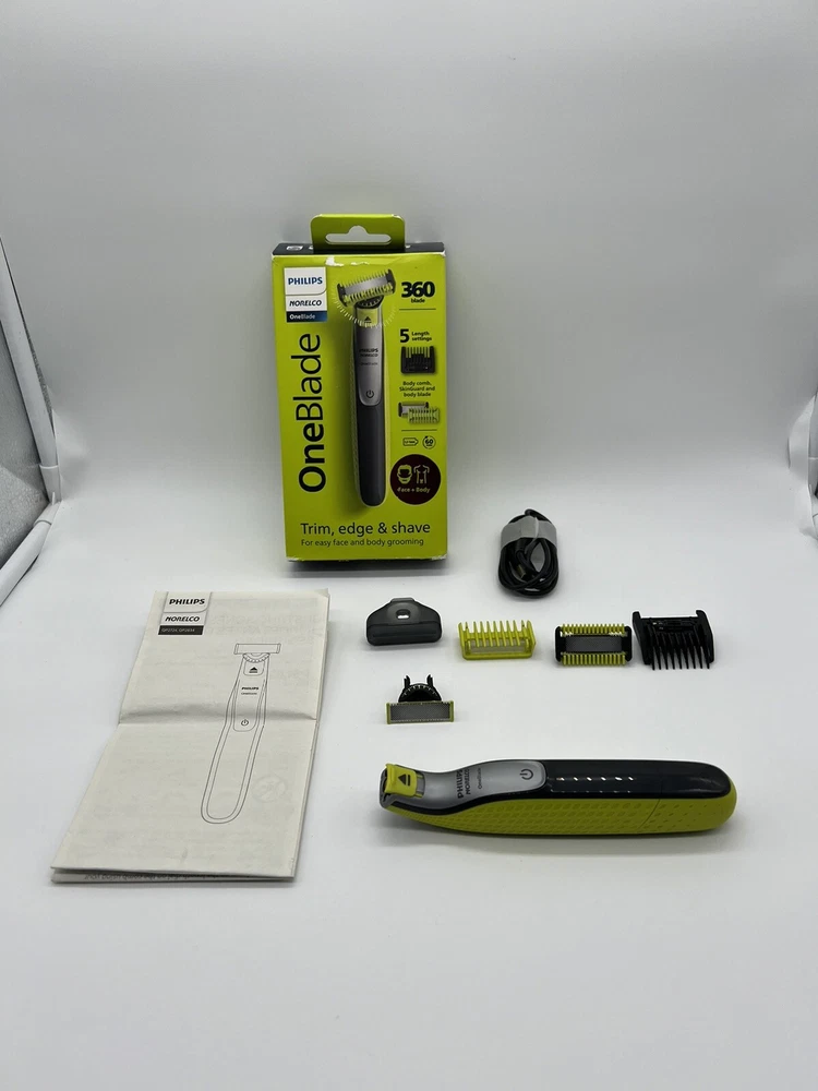 One Blade. philips Norelco 360blade 5length settings Open Box. Item: S1(9) Rechargeable OneBlade 360 Face plus Body can trim, edge, and shave any length of hair. Shave is not too close so your skin stays comfortable. The innovative 360 Blade can flex in all directions to adjust to the curves of your face. The design enables constant skin contact and control. Includes 2 blades, 1 360 blade for your face and 1 blade for your body. Use wet or dry, with or without foam. Click-on skin guard for extra protection on sensitive areas, even below the belt. Includes a 5-in-1 stubble comb plus 1 body comb for an even trim on face or body USB-A charging cable included (wall power adapter not included). Subscribe and Save on Philips Norelco OneBlade 360 replacement blades and save up to 15 percent . Includes: 1 handle, 1 360 blade for face, 1 blade for body, 1 5-in-1 comb for face, 1 skin guard for body, 1 body comb, 1 USB-A charging cord (wall power adapter not included), 1 protective cap. 2023 Men’s Health Award winner for “Best Electric Razor”