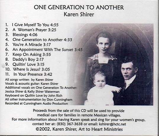 Click Here to add ChainMan Books and Music your Favorite Seller's List # Title/Songwriter Time 1 I Give Myself to You 4:56 2 A Woman's Prayer 3:26 3 Blessings 4:07 4 One Generation to Another 4:34 5 You're A Miracle 3:19 6 An Appointment with the Sunset 3:46 7 Keep on Asking 3:56 8 Daddy's Boy 2:19 9 Quiltin' Love 3:17 10 Where is Jesus? 3:06 11 In Your Presence 3:41 To Top Copyright © ChainMan Books and Music 2014 - 2023 Buy more - save more 10% off 2, 20% off 3, 30% off 4 or more on all items. Save 50% when you buy 5 or more Christian items.