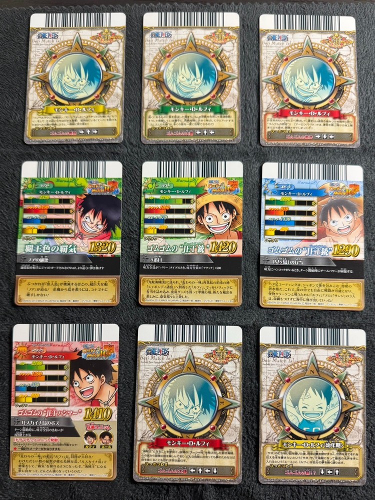Title: 9x One Piece Berry Match Card Lot - Monkey D. Luffy [Condition] Excellent to Near Mint These cards have been kept in a collection and are in great vintage condition. No major creases or heavy damage. There may be some minor surface scratches or slight wear on the edges due to age (released around 2008). Please check the photos carefully for the exact condition. [Product Details] Series: One Piece Berry Match (Japanese Arcade Game Cards) Character: Monkey D. Luffy Quantity: 9 cards Language: Japanese Manufacturer: Bandai [Shipping & Handling] The cards will be packed securely with sleeves and top-loaders (or cardboard reinforcement) to prevent bending during transit. Ships from Japan via FedEx or DHL (with Tracking Number) . Delivery usually takes 3-7 business days . Packed securely with sleeves and cardboard reinforcement.