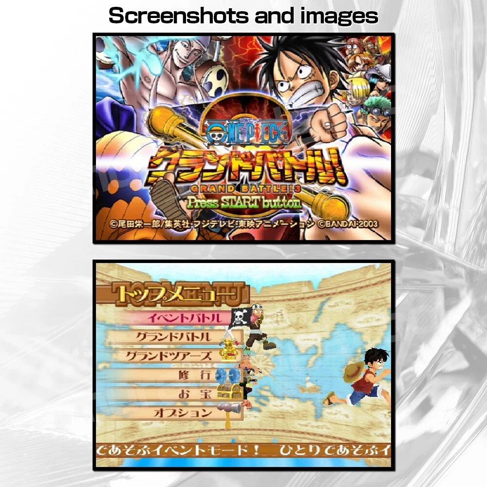 One Piece: Grand Battle! 3 One Piece: Round the Land One Piece: Grand Battle! Rush! Fighting for One Piece One Piece: Pirates Carnival - Japanese Version - ※Region Code:NTSC-J (Japan) Description ■Set Contents(5Games) (1)One Piece: Grand Battle! 3 (2)One Piece: Round the Land (3)One Piece: Grand Battle! Rush! (4)Fighting for One Piece (5)One Piece: Pirates Carnival ■Product Features These are PlayStation 2 games based on the manga and anime "One Piece." ■Product status:Very Good ■Product content (1)Original Package (2)Manual (3)Game Disc Payment Buyers accept a variety of payment methods including credit and debit cards, Apple Pay, Google Pay and PayPal. Shipping Shipping is Economy and Expedited and Standard. ■Economy Shipping:Free Shipping ■Expedited and Standard Shipping:FedEx or EMS and Yamato Japan(There is an extra charge.) ※Depending on the shipping area, only Economy Shipping is available. Notice ■The language of the game is Japanese. ■Platform:PlayStation 2 ■PlayStation 2 is not included. ■The region code for this game is Japan. International Buyers - Please Note: Import duties, taxes, and charges are not included in the item price or shipping cost. These charges are the buyer's responsibility. Please check with your country's customs office to determine what these additional costs will be prior to bidding or buying. If the cancellation is due to the buyer,we will charge a PayPal fee. If there is a remote charge for your address,we will charge you for additional shipping. Thank you for your understanding.