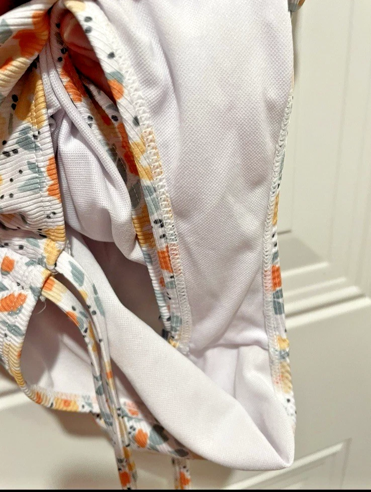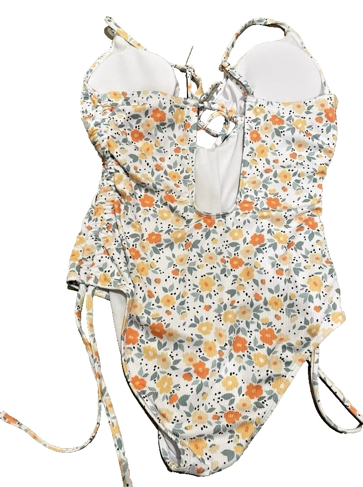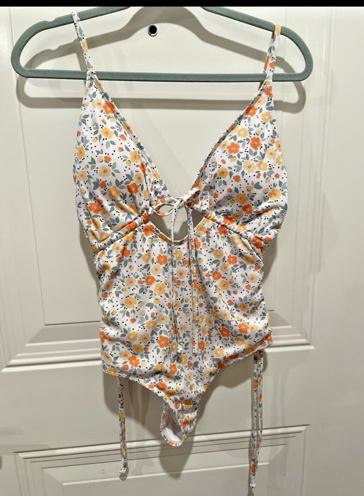 This swimsuit is pre-owned and has no visible signs of wear. If you would like measurements or have any questions, please feel free to send me a message. Size XL Beautiful floral pattern Unique hollow out design Comfortable polyester blend material Machine washable for easy care Adjustable straps Padded feature for added comfort and support