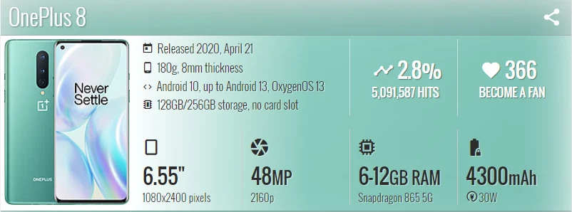 OnePlus 8 5G 8+128GB/256GB Storage Dual SIM 4300mAh Android Unlocked-New Sealed Carrier and Activation: This Phone is Unlocked for GSM Networks. Works with: AT&T, T-Mobile, Metro PCS, Simple Mobile, Straight-Talk Rogers, H20, Net10, Fido and all other USA and Worldwide GSM carrier and networks. Please note that this phone will NOT work with CDMA carriers such as Verizon, Pageplus and Sprint 1* Retail Box 1 * OnePlus 8 Smartphone 1* Charger 1* Cable 1* Manual NETWORK Technology GSM / CDMA / HSPA / LTE / 5G 2G bands GSM 850 / 900 / 1800 / 1900 - SIM 1 & SIM 2 CDMA 800 / 1900 & TD-SCDMA 3G bands HSDPA 800 / 850 / 900 / 1700(AWS) / 1800 / 1900 / 2100 4G bands 1, 2, 3, 4, 5, 7, 8, 12, 13, 17, 18, 19, 20, 25, 26, 28, 32, 34, 38, 39, 40, 41, 42, 46, 66 - EU 1, 2, 3, 4, 5, 7, 8, 12, 13, 17, 18, 19, 20, 25, 26, 28, 29, 30, 34, 38, 39, 40, 41, 46, 48, 66, 71 - NA 1, 2, 3, 4, 5, 7, 8, 12, 17, 18, 19, 20, 26, 34, 38, 39, 40, 41, 46 - IN 1, 2, 3, 4, 5, 7, 8, 12, 17, 18, 19, 20, 26, 34, 38, 39, 40, 41 - CN 5G bands 1, 3, 7, 28, 78 SA/NSA - EU 2, 5, 41, 66, 71 SA/NSA - NA 78 SA/NSA - IN 41, 78, 79 SA/NSA - CN Speed HSPA 42.2/5.76 Mbps, LTE (5CA) Cat18 1200/150 Mbps, 5G 7.5 Gbps DL LAUNCH Announced 2020, April 14 Status Available. Released 2020, April 21 BODY Dimensions 160.2 x 72.9 x 8 mm (6.31 x 2.87 x 0.31 in) Weight 180 g (6.35 oz) Build Glass front (Gorilla Glass 5), glass back (Gorilla Glass 5), aluminum frame SIM Dual SIM (Nano-SIM, dual stand-by) DISPLAY Type Fluid AMOLED, 90Hz, HDR10+ Size 6.55 inches, 103.6 cm 2 (~88.7% screen-to-body ratio) Resolution 1080 x 2400 pixels, 20:9 ratio (~402 ppi density) Protection Corning Gorilla Glass 5 PLATFORM OS Android 10, upgradable to Android 13, OxygenOS 13 Chipset Qualcomm SM8250 Snapdragon 865 5G (7 nm+) CPU Octa-core (1x2.84 GHz Cortex-A77 & 3x2.42 GHz Cortex-A77 & 4x1.80 GHz Cortex-A55) GPU Adreno 650 MEMORY Card slot No Internal 128GB 8GB RAM, 256GB 12GB RAM UFS 3.0, 2-LANE MAIN CAMERA Triple 48 MP, f/1.8, 26mm (wide), 1/2.0", 0.8µm, PDAF, OIS 16 MP, f/2.2, 14mm, 116˚ (ultrawide), 1/3.6", 1.0µm 2 MP, f/2.4, (macro) Features Dual-LED flash, HDR, panorama Video 4K@30/60fps, 1080p@30/60/240fps, Auto HDR, gyro-EIS SELFIE CAMERA Single 16 MP, f/2.4, (wide), 1/3.06", 1.0µm Features Auto-HDR Video 1080p@30fps, gyro-EIS SOUND Loudspeaker Yes, with stereo speakers 3.5mm jack No COMMS WLAN Wi-Fi 802.11 a/b/g/n/ac/6, dual-band, Wi-Fi Direct, DLNA Bluetooth 5.1, A2DP, LE, aptX HD Positioning GPS (L1+L5), GLONASS (G1), BDS (B1), GALILEO (E1+E5a) NFC Yes Radio No USB USB Type-C 3.1, OTG FEATURES Sensors Fingerprint (under display, optical), accelerometer, gyro, proximity, compass BATTERY Type Li-Po 4300 mAh, non-removable Charging 30W wired, 50% in 22 min (advertised) MISC Colors Onyx Black, Glacial Green, Interstellar Glow, Models IN2013, IN2017, IN2010, IN2019