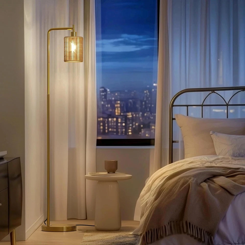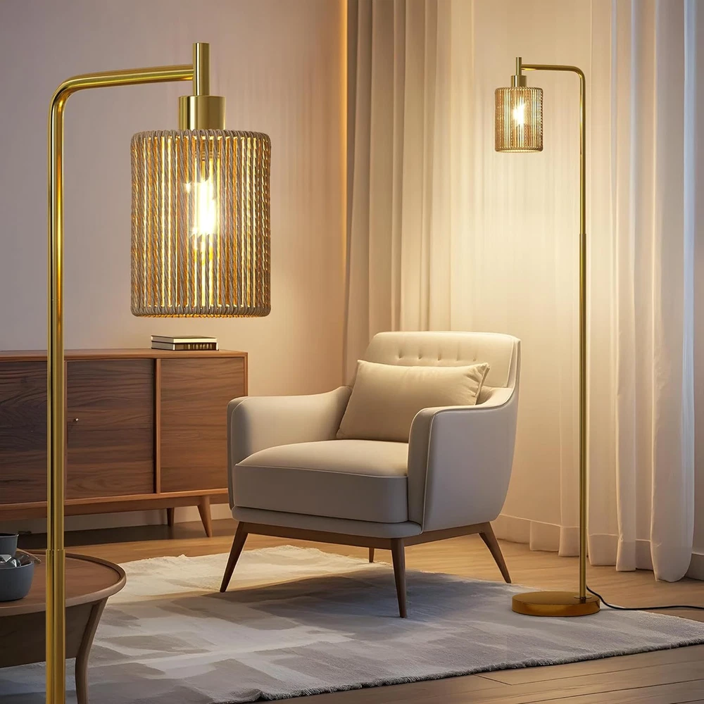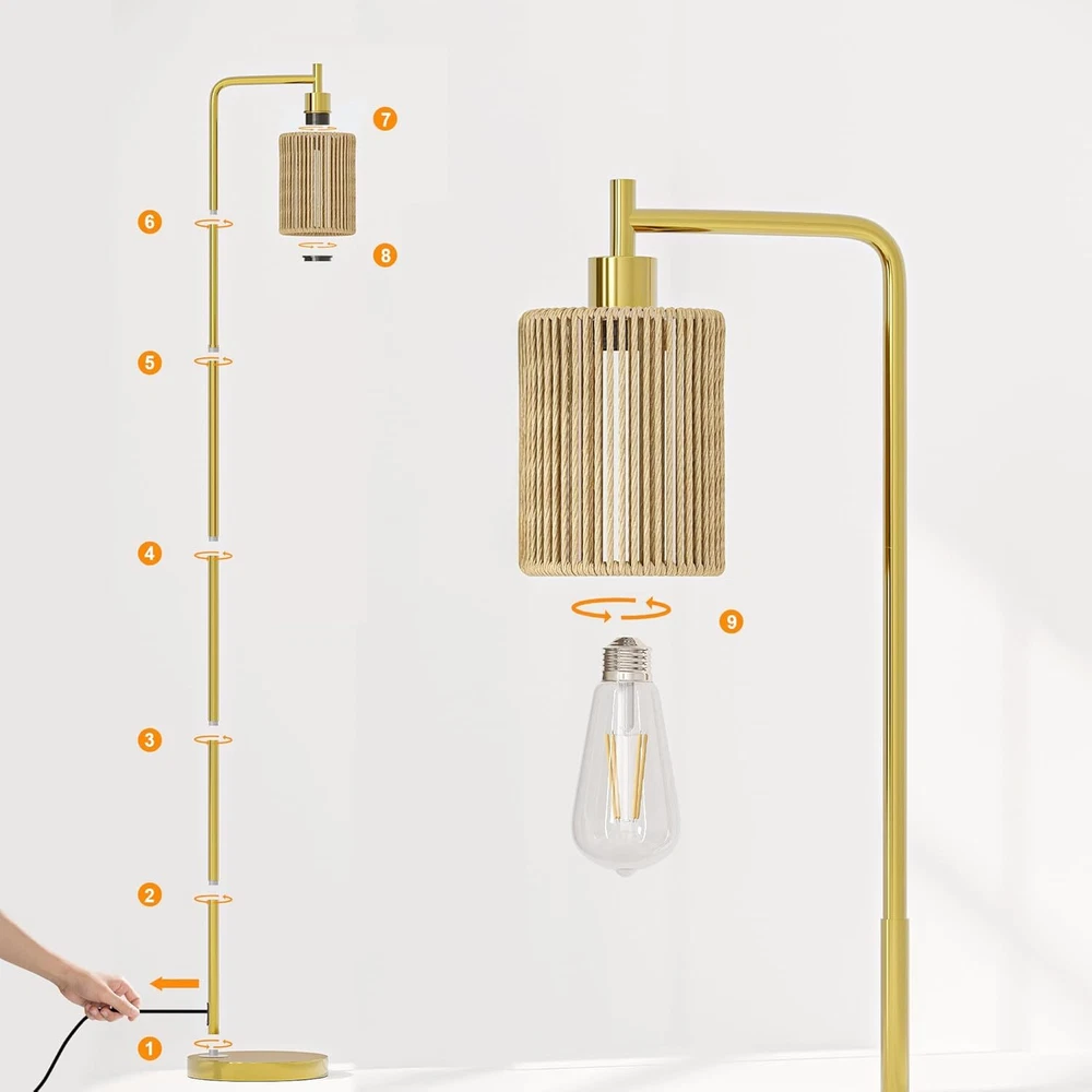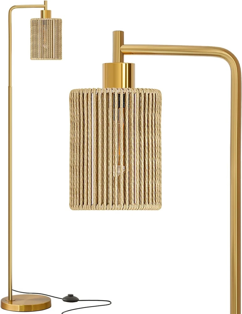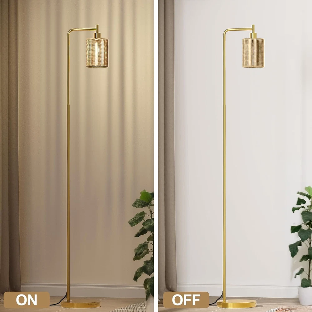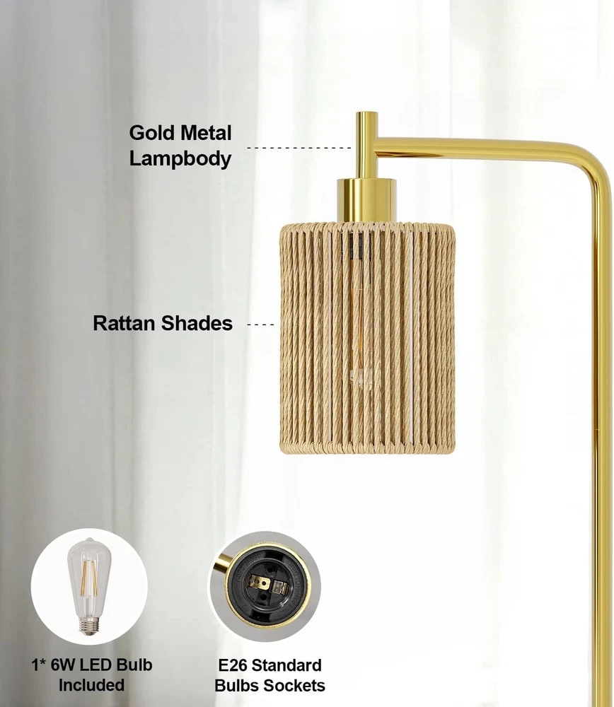 Oneach 66" Gold Floor Lamp for Living Room, Boho with LED Product Details Finish Type: Polished Base Material: Metal Bulb Base: E26 Product Dimensions: 12"D x 9.5"W x 66"H Lamp Type: Floor Lamp Shade Color: Gold Shade Material: Rattan Switch Type: Foot Style: Modern Brand: Oneach Color: Gold Special Feature: Corded Light Source Type: LED Material: Metal Room Type: Office, Living Room, Bedroom Power Source: Corded Electric Controller Type: Foot Control Number of Light Sources: 1 Included Components: Bulb included Is Waterproof: false Bulb Shape Size: A19 Mounting Type: Floor Mount Wattage: 6 watts Number of Items: 1 Lighting Method: LED Control Method: Remote Indoor/Outdoor Usage: Indoor Efficiency: Energy Efficient Voltage: 110 Volts Base Diameter: 9.5 Inches Is Cordless?: No Manufacturer: Oneach Home Shade Height: 61 Inches Item Weight: 9.24 pounds Country of Origin: China Item model number: MZ-F1222 Finish types: Polished Special Features: Corded Batteries Included?: No Batteries Required?: No Product Dimensions : 12 x 9.5 x 66 inches; 9.26 Pounds Item model number : MZ-F1222 Manufacturer : Oneach Home Country of Origin : China Finish Type: Polished Base Material: Metal Bulb Base: E26 Product Dimensions: 12"D x 9.5"W x 66"H Lamp Type: Floor Lamp Simple Design Gold Floor Lamp: This 66inch gold floor lamp features a sleek and minimalist design, making it a perfect complement to various decor styles in your living room, bedroom, study, restaurant, or office. We have designed 3 different lamp shades for selection, you can choose from glass shade, rattan shade, or cage shade with paper rope wrapped around the metal, just depending on your preference or your individual needs Come with a 6W LED Bulb: This tall lamp comes with a 6W bulb, so that you can use the floor lamp right after you receive without purchase an extra bulb. Compatible with E26 bulb socket, allowing you to customize your lighting with a variety of bulbs to suit your preference and needs. Just DIY it Sturdy Base and Quality Material:This gold floor lamp is made of high-quality metal material and built with a robust base. Ensuring it remains upright and secure without the risk of tipping or falling over, making it safe for households with children or pets Convenient Foot Switch: Designed for easy accessibility, the foot switch on the cord allows you to effortlessly turn the gold standing lamp on and off with just a tap of your foot, adding convenience to your lighting experience. The extended 6ft cord allows you to place the floor lamp anywhere you want, such as near seats, sofas, side tables, beds Easy Assembly: This living room floor lamp can be easily assembled without any tools. Just simply follow the user manual step by step to combine all the accessories and you'll be able to assemble the tall lamp in less than a few minutes