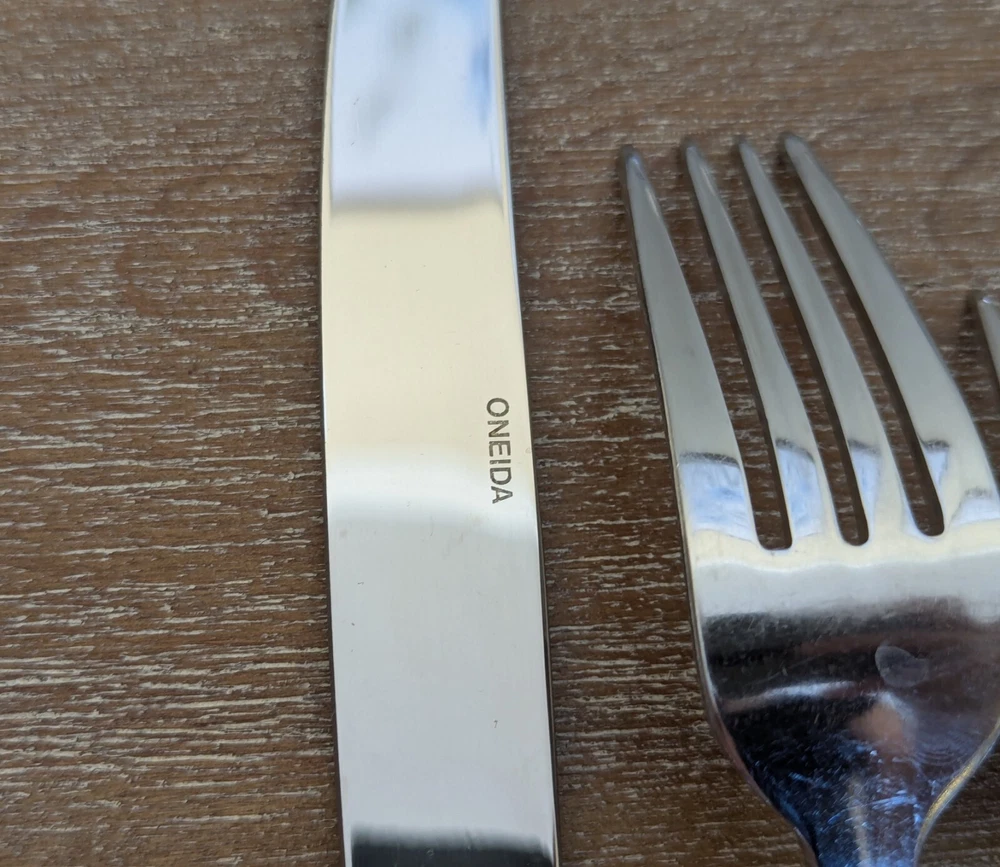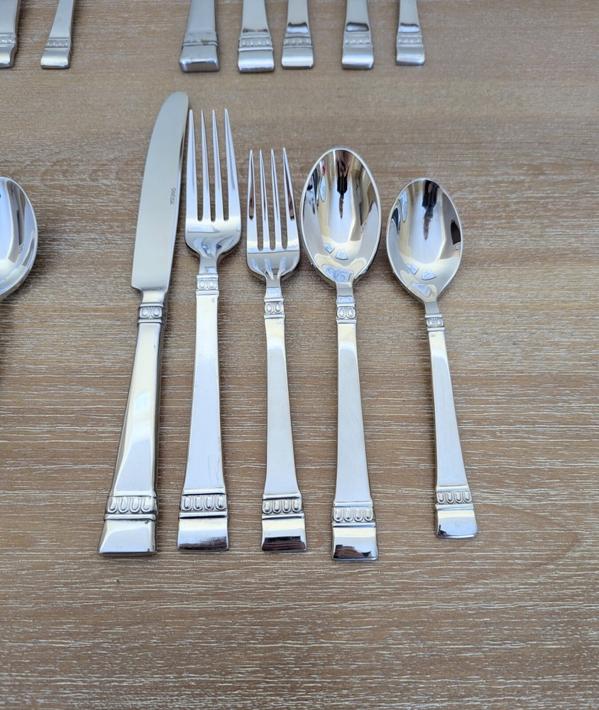 Oneida CADENCE 18/10 Stainless Indonesia 35 Piece SET Teaspoon Salad Dinner Fork Includes: 6 x dinner knife 6 x dinner fork 6 x salad fork 6 x soup spoon 6 x teaspoon 1 x serving spoon 1 x slotted serving spoon 1 x serving fork 1 x sugar spoon 1 x butter knife **Gently used set in Excellent pre-owned condition! Just Lovely!! **SEE PHOTOS! From a pet-free & smoke-free home. Shipped quickly and carefully from Kansas! Thank you for looking 😊 -------------------------