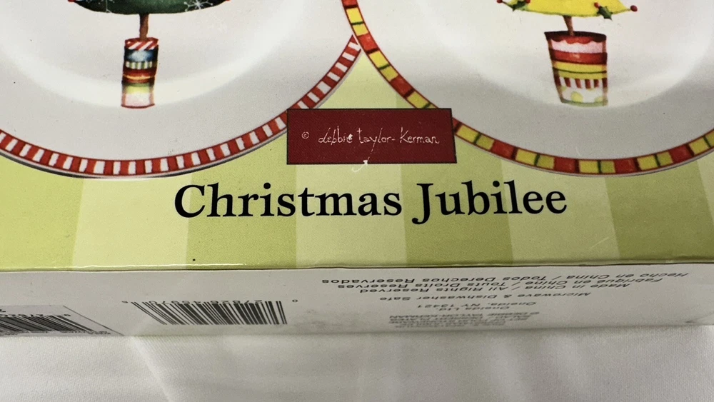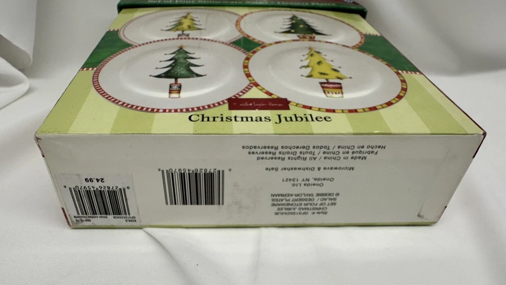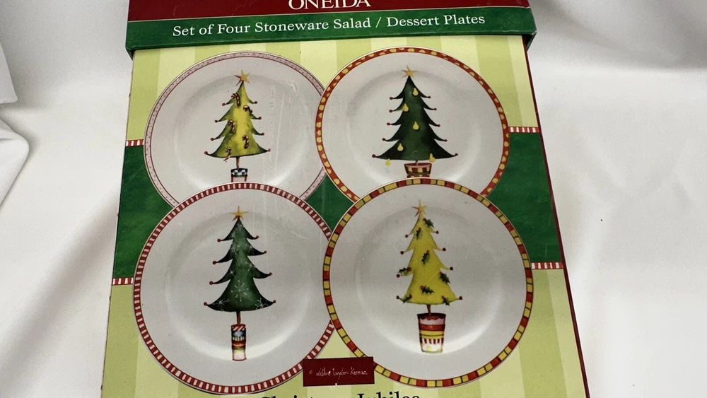 Add some festive flair to your dinner table with this set of four Oneida Christmas Jubilee Stoneware Salad/Dessert Plates. Each plate has a diameter of 8 inches and features a charming Christmas tree pattern in vibrant multicolor. Perfect for your holiday celebration, these plates are made of durable stoneware and can withstand daily use. These contemporary original plates are not only functional but also decorative. They are suitable for any Christmas occasion, and their art pottery production style adds to their uniqueness. Get ready to impress your guests with these ONEIDA plates without worrying about their quality, as they are brand new.