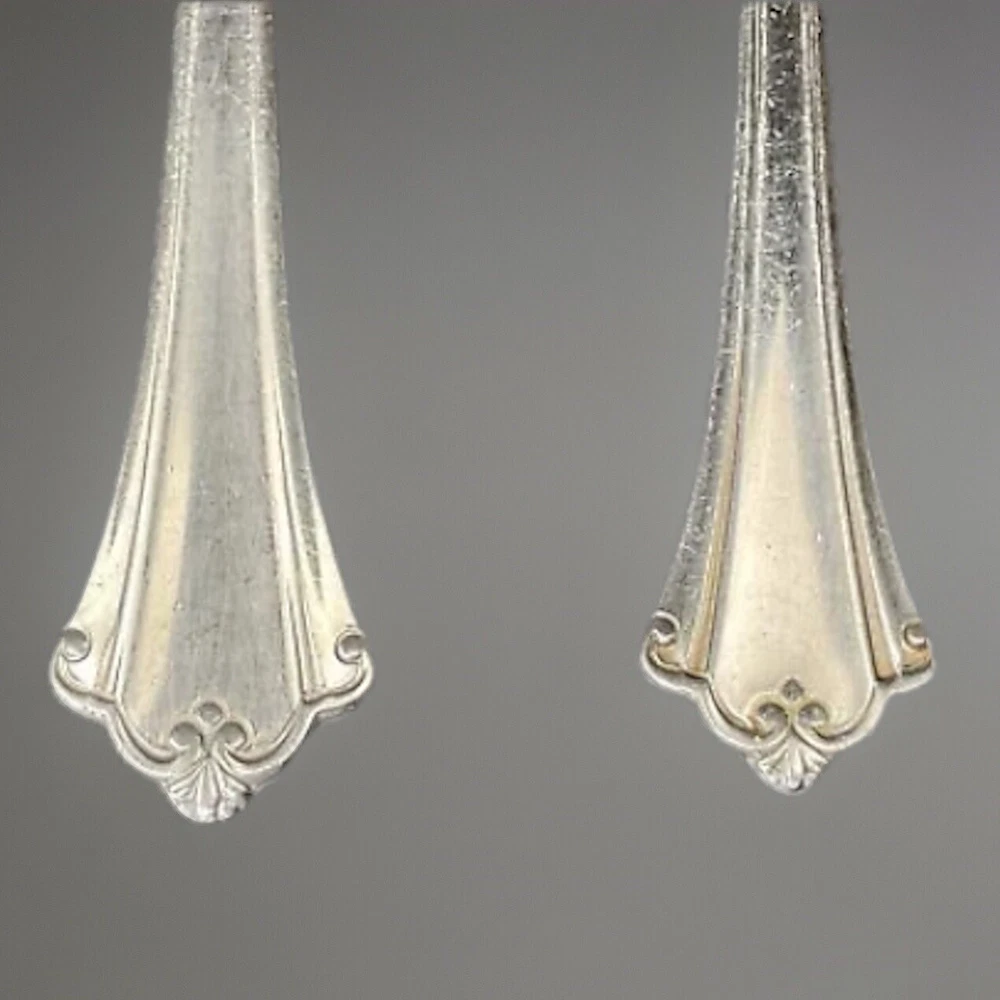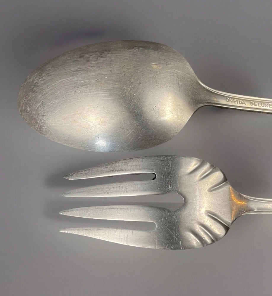 Replacement tablespoon and salad fork in the “Anticipation” pattern for Oneida Deluxe flatware line. Please see photos for conditional details and measurements. Please note the fork’s chipped tine and scratches. These are in preowned condition with visible wear.