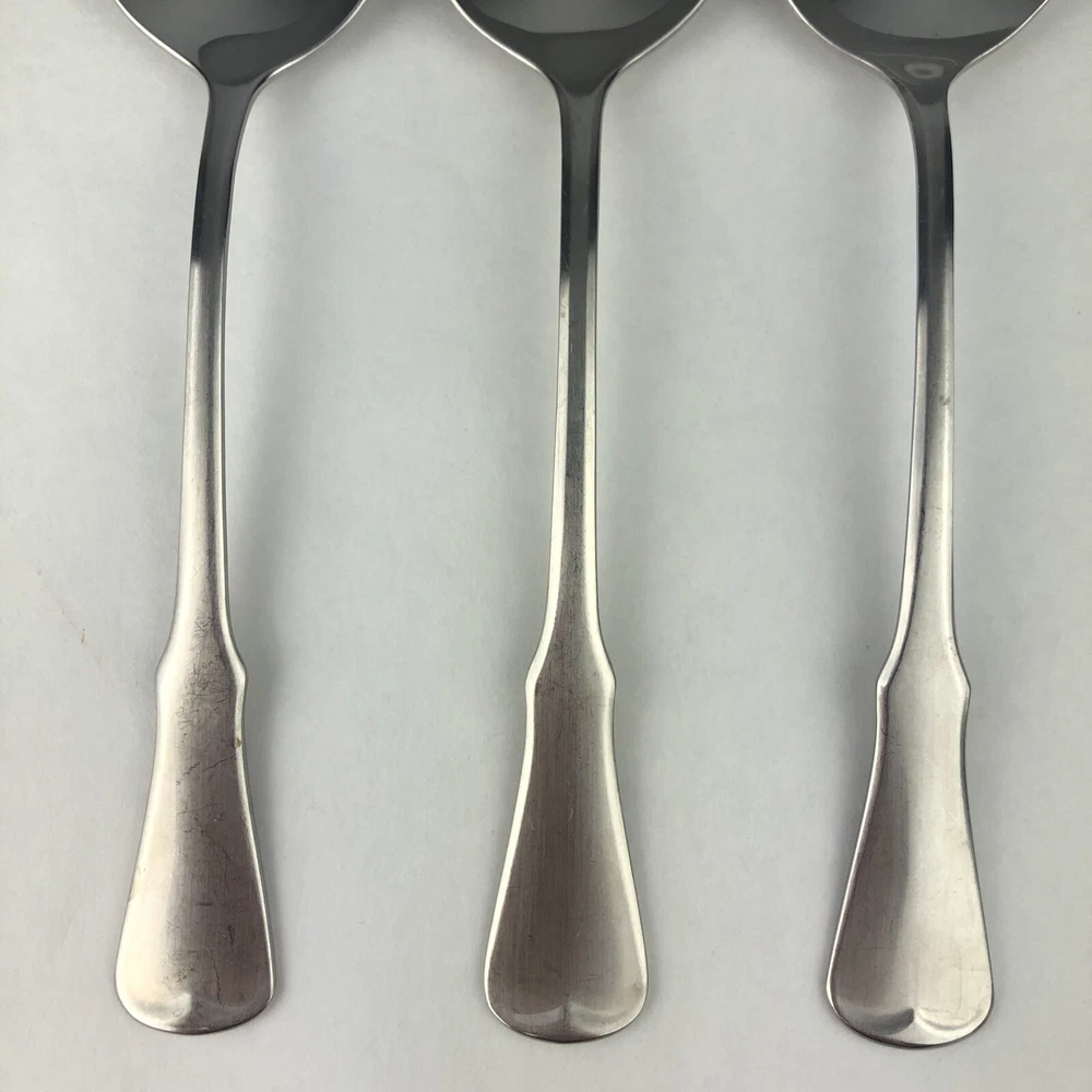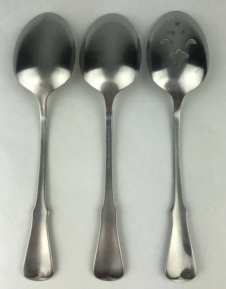 Vintage Oneida PATRICK HENRY Community Stainless 3 Piece lot includes: 2 solid serving spoons ~ 8.25" 1 pierced serving spoon ~ 8.25" Shows signs of light use and may need additional cleaning. Little spotting in places but no dishwasher or disposal damage. Overall very nice condition. Please see pictures for details as this is part of my description.