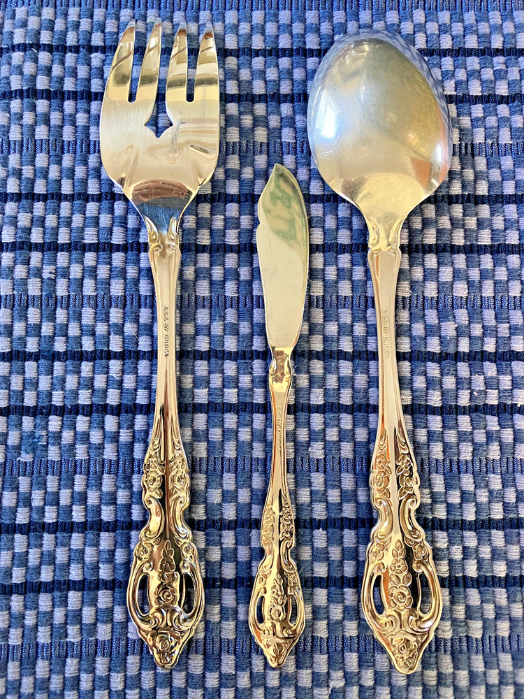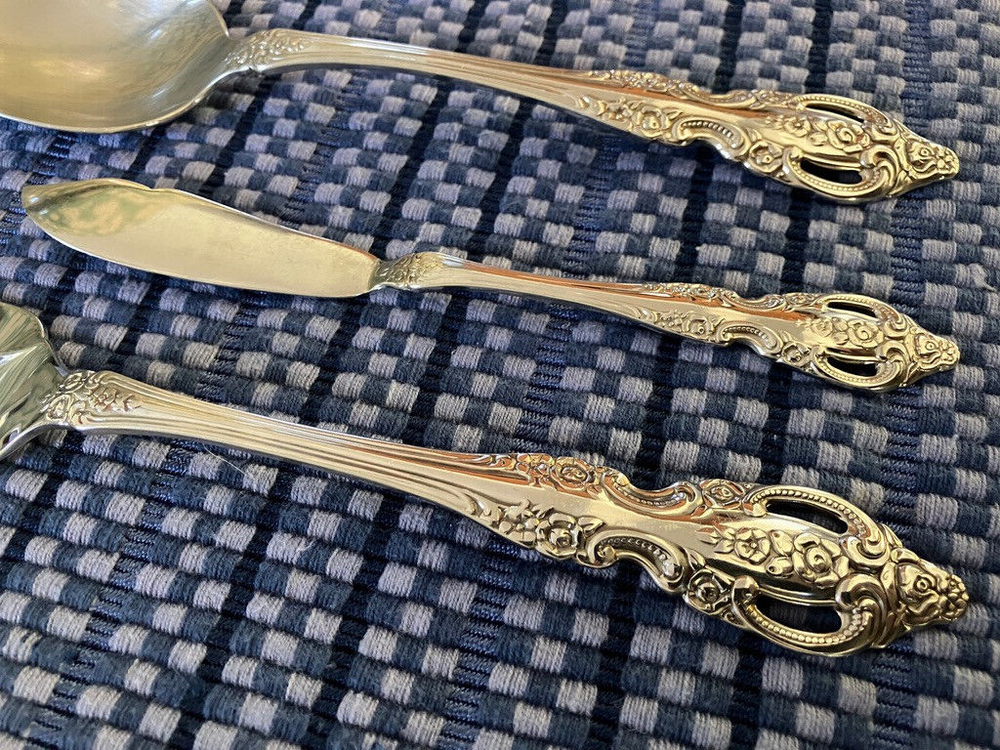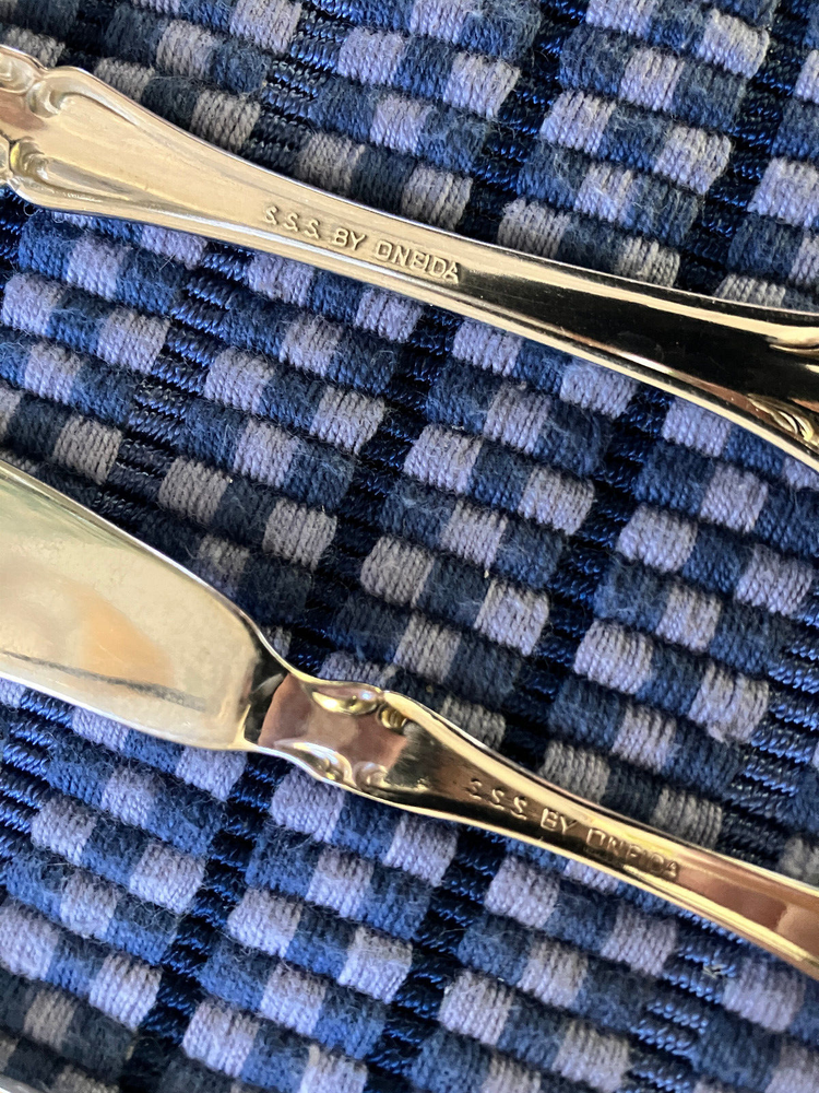 3 Piece ONEIDA 'Renoir/Pembroke' Stainless Hostess Set Includes: (1) Butter Knife 6-3/8" (1) Serving Spoon 8-1/2" (1) Meat Fork 8-1/2" Marked "S.S.S. by Oneida" In very good condition, normal use marks. See photos for details . Comes from a smoke-free environment. (Gold color is from lighting, utensils are stainless steel.)