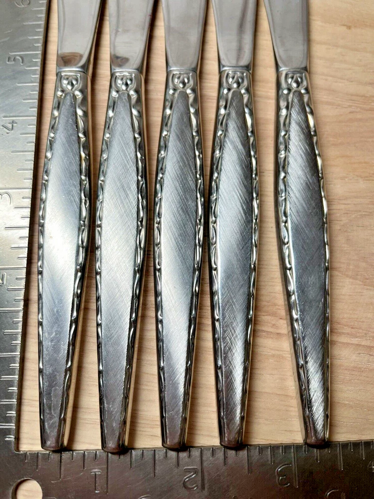 Oneida Venetia lot 5 Dinner Knives Community Stainless flatware Burnished glossy LENGTH 9 1/8" Pieces are marked: Community Stainless (except knives) CHECK OUT MY EBAY STORE!!! We are happy to combine purchases to give you the best shipping rates possible. When you have finished shopping, please ask for an updated invoice before making your payment. Your order will be shipped as soon as we receive your payment Please be sure your shipping address is correct when you make your payment.