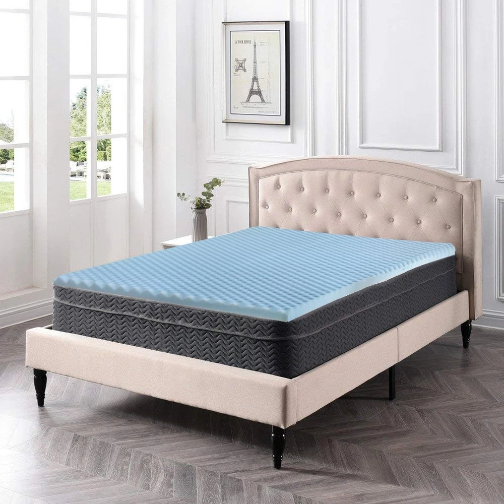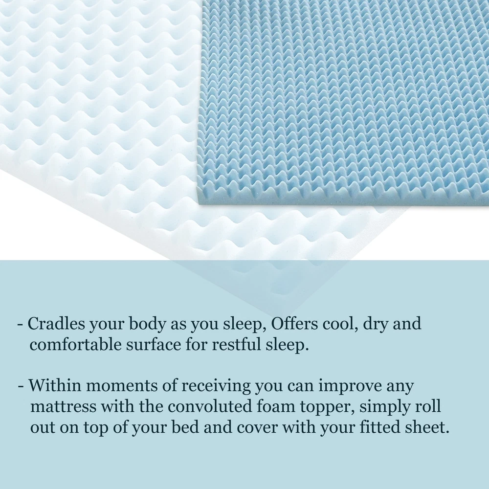 Pressure Relief: The convoluted design of the foam topper provides targeted pressure relief and support to different parts of the body. This can help reduce pain and discomfort in areas such as the hips, shoulders, and back. Temperature Regulation: The addition of gel to the foam can help regulate body temperature, keeping you cool throughout the night. This can be particularly helpful for people who tend to sleep hot. Motion Isolation: Memory foam toppers, including convoluted gel memory foam toppers, are known for their ability to isolate motion. This means that if your partner moves around in bed, you are less likely to be disturbed by their movements. Durability: Convoluted gel memory foam toppers are designed to be durable, Free Shipping Over $49.99* Details Onetan,1-inch High Density Convoluted Egg Shell Breathable Cool Gel Foam Product Description: Pressure ReliefThe convoluted design of the foam topper provides targeted pressure relief and support to different parts of the body. This can help reduce pain and discomfort in areas such as the hips, shoulders, and back. Temperature RegulationThe addition of gel to the foam can help regulate body temperature, keeping you cool throughout the night. This can be particularly helpful for people who tend to sleep hot. Motion IsolationMemory foam toppers, including convoluted gel memory foam toppers, are known for their ability to isolate motion. This means that if your partner moves around in bed, you are less likely to be disturbed by their movements. Durability Convoluted gel memory foam toppers are designed to be durable, which means they can provide consistent support and pressure relief for several years. CertiPUR-US® certified foamRest easy knowing that the topper's foams are CertiPUR-US® certified, meeting stringent standards for durability, performance, and content. Quality you can trust.