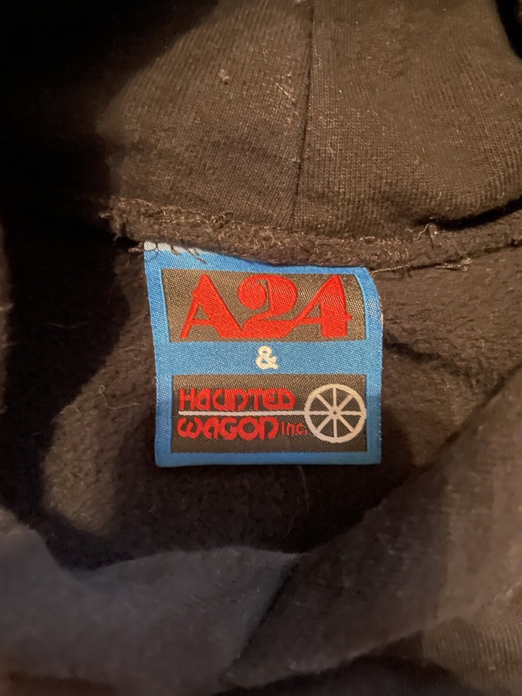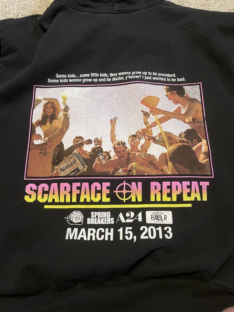 The Online Ceramics A24 Spring Breakers Hoodie in XL is a stylish and comfortable pullover made from soft cotton fleece material. With long sleeves, a hood, and a regular fit, this black hoodie is perfect for the spring season. Featuring the unique A24 Spring Breakers theme, this hoodie is machine washable and proudly made in the United States by the brand Online Ceramics. Ideal for men looking for a cozy yet fashionable activewear option.