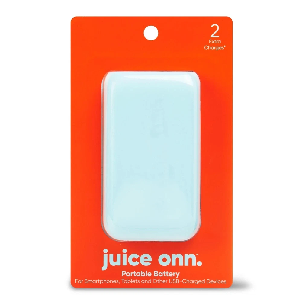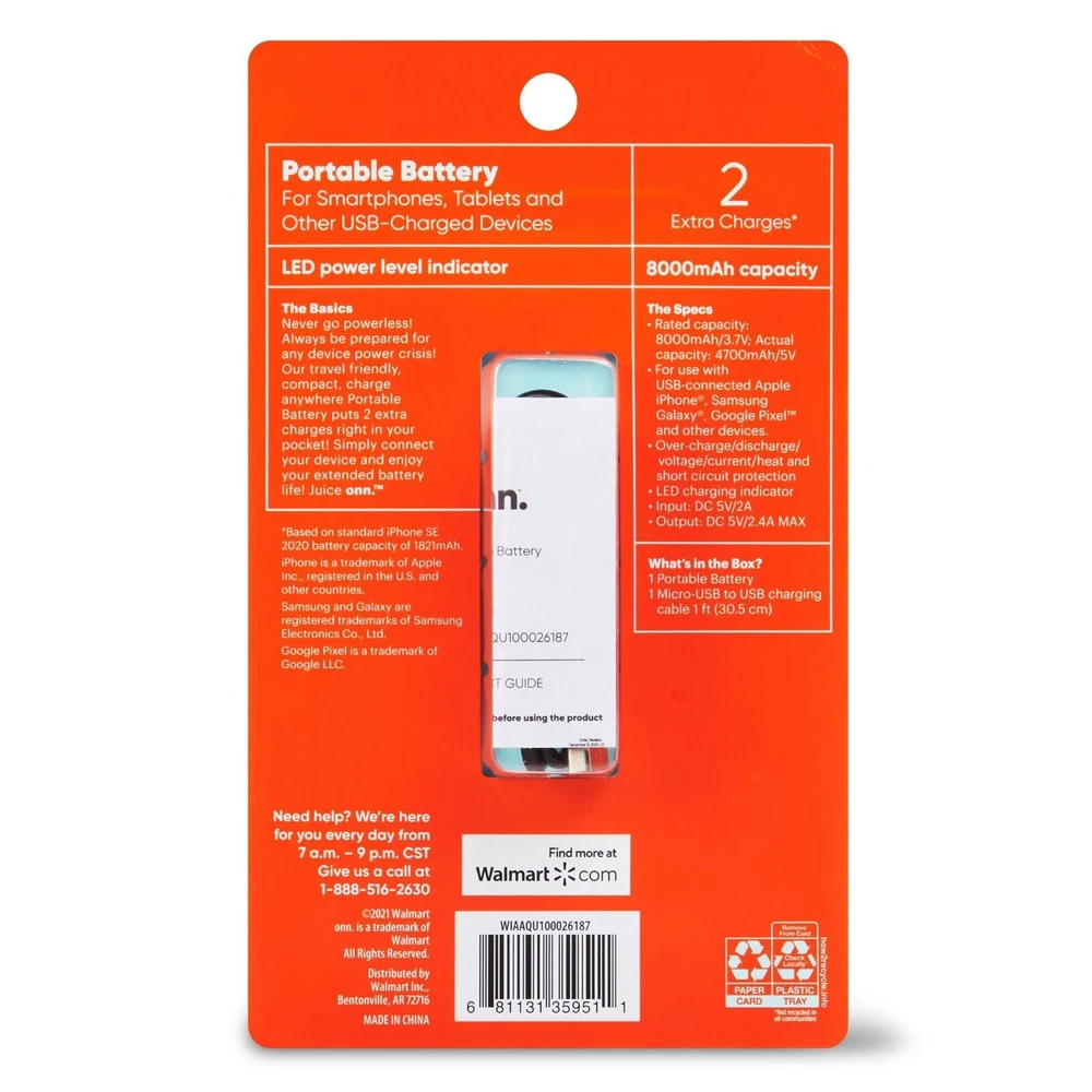 Onn Portable Battery 8K mAh - Aqua Charges smartphones, tablets, and USB-charged devices Provides 2 extra charges Portable power for use with Apple iPhone, Samsung Galaxy, Google Pixel, and other devices LED charging indicator Rated capacity: 8000mAh/3.7V; actual capacity: 4700mAH/5V Over-charge/discharge/voltage/current/heat & short-circuit protection Input: DC 5V/2A Output: DC 5V/2.4A Juice onn. What's in the box: 1 Portable Battery, 1 micro-USB to USB charging cable 1 ft (30.5 cm)