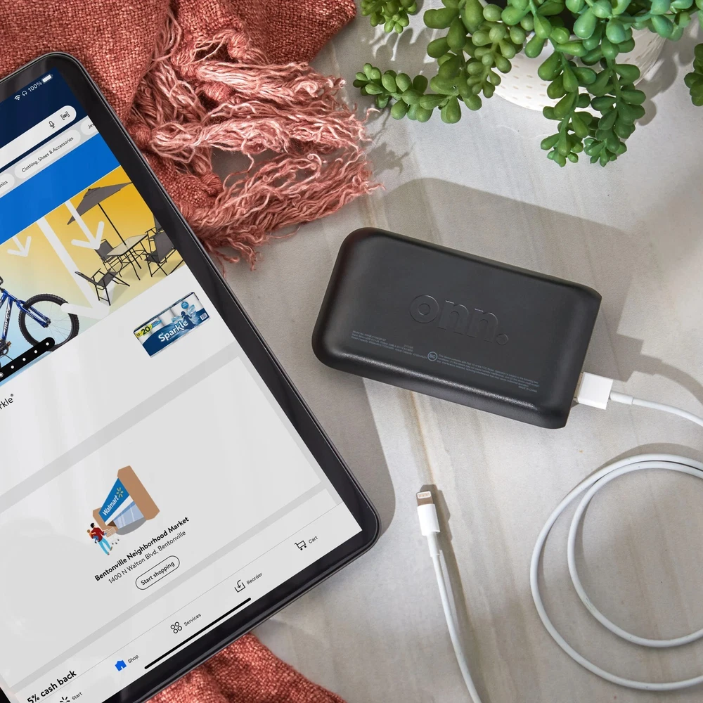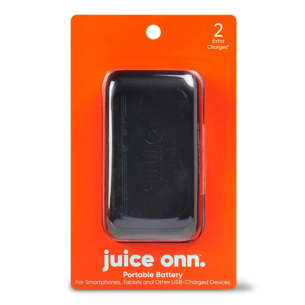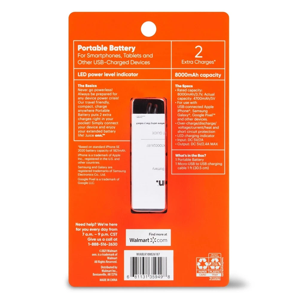 onn. Portable Battery - Compact and Travel Friendly with 8k mAh Capacity for Smartphones and Tablets Charges smartphones, tablets, and USB-charged devices Provides 2 extra charges Portable power for use with Apple iPhone, Samsung Galaxy, Google Pixel, and other devices LED charging indicator Rated capacity: 8000mAh/3.7V; actual capacity: 4700mAH/5V Over-charge/discharge/voltage/current/heat & short-circuit protection Input: DC 5V/2A Output: DC 5V/2.4A Juice onn. What's in the box: 1 Portable Battery, 1 micro-USB to USB charging cable 1 ft (30.5 cm)