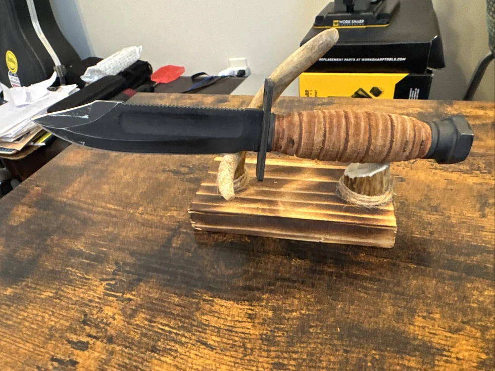 This Ontario Knife Company fixed blade knife is a must-have for any hunting, combat, or survival situation. Its durable construction and sharp blade make it a reliable tool for any task. The knife's sheath is designed for easy carrying and storage, ensuring it's always within reach when you need it. Includes sharpening stone Whether you're an avid hunter, a combatant, or a survivor, this knife is the perfect addition to your toolkit. Its modern design and factory-manufactured quality make it a top-of-the-line choice for any knife enthusiast. Ontario Knife Company has a reputation for excellence, and this knife is no exception. Get yours today and experience the ultimate in hunting, combat, and survival.