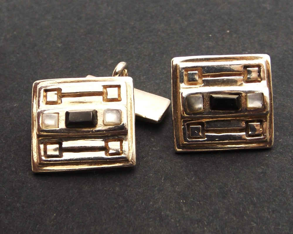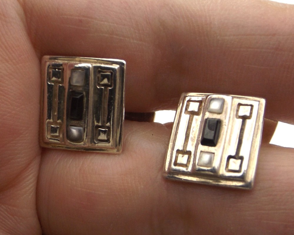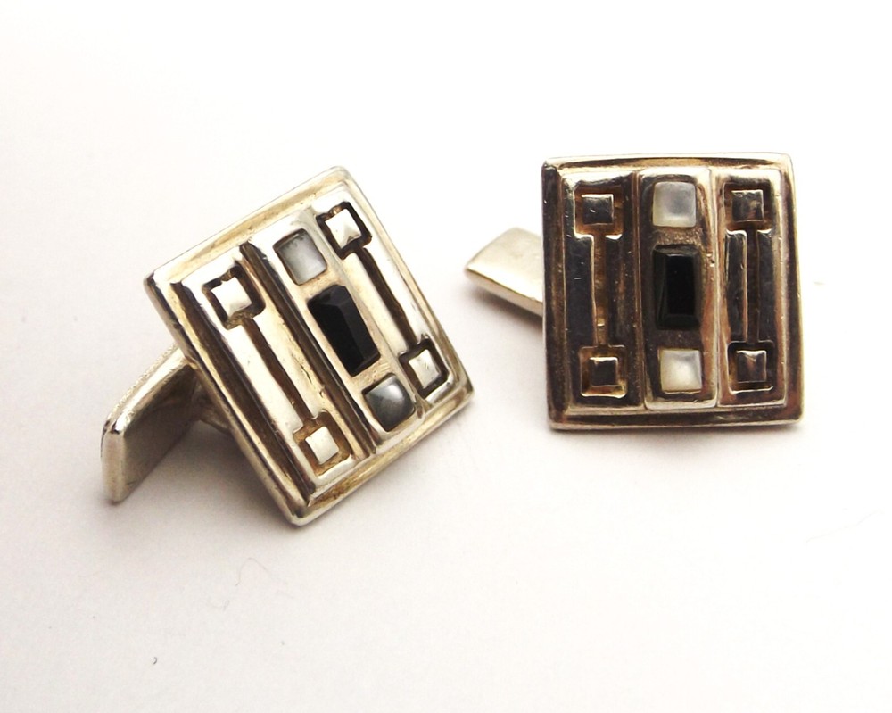 Onyx and moonstone sterling silver square cufflinks by Kit Heath 1996