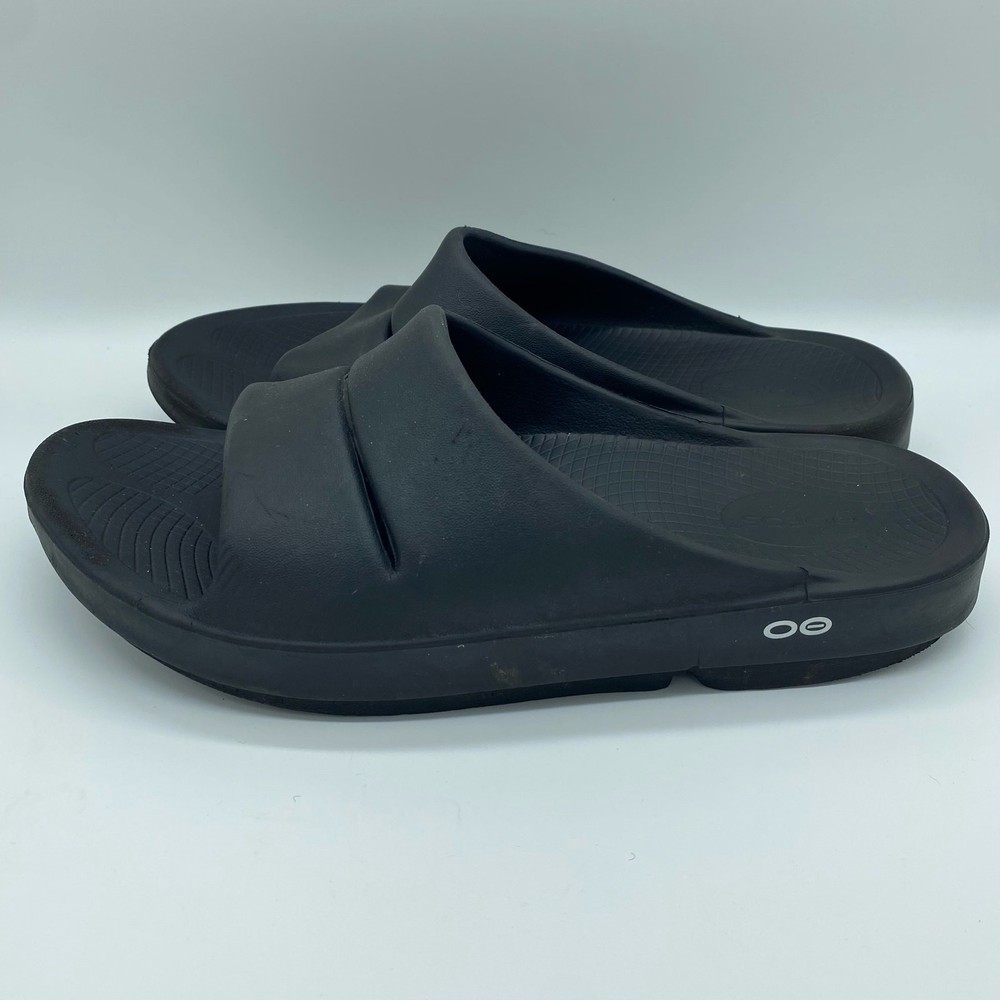 Oofos Men's size 10 Black Rubber Slide Sandals Comfort Shoes. Oofos brand sandals in a men's size 10 or women's size 12. Black colorway in a rubber material. Straps across the tops of the feet. Comfort shoes. In great pre-owned condition, see photos for more details. Always feel free to ask any questions you may have! Reasonable offers accepted.