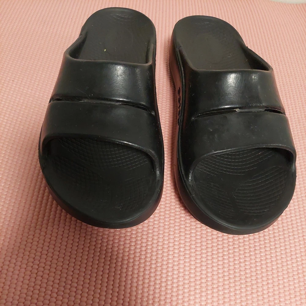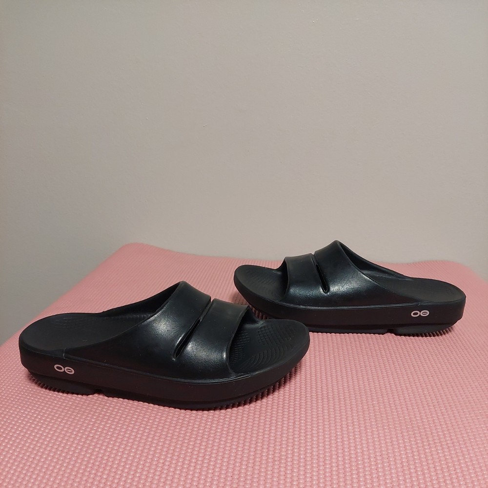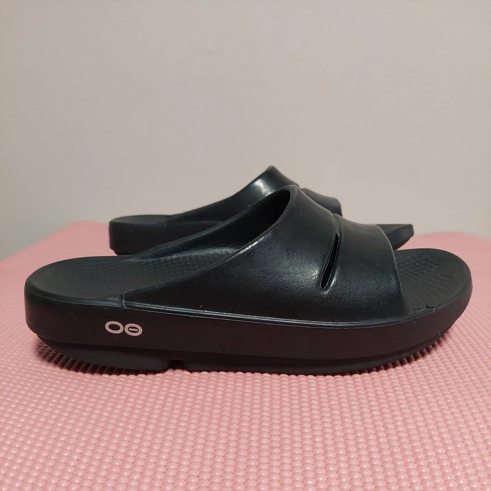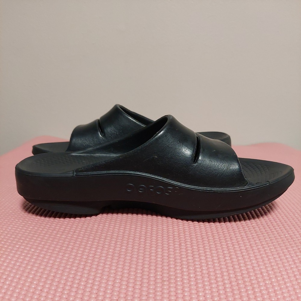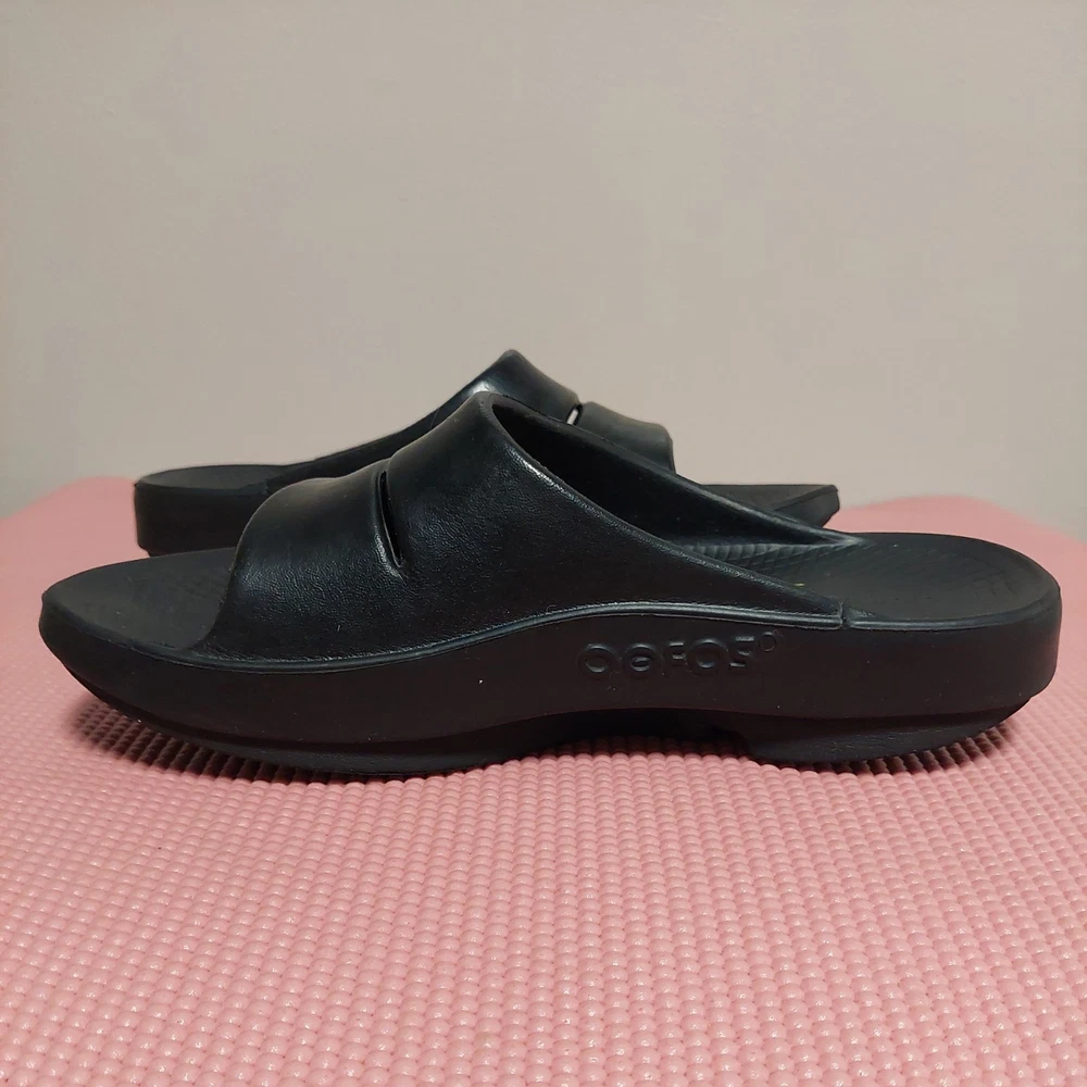 The Oofos OOahh Slide Sandal in men's size 6 (women's size 8) is a slip-on style featuring a solid black color and a comfortable foam insole. Made with a rubber upper material, these sandals are designed for casual occasions with a focus on providing comfort. The Oofos brand is known for its supportive footwear, making these slides a practical choice for those looking for ease and style in their footwear.