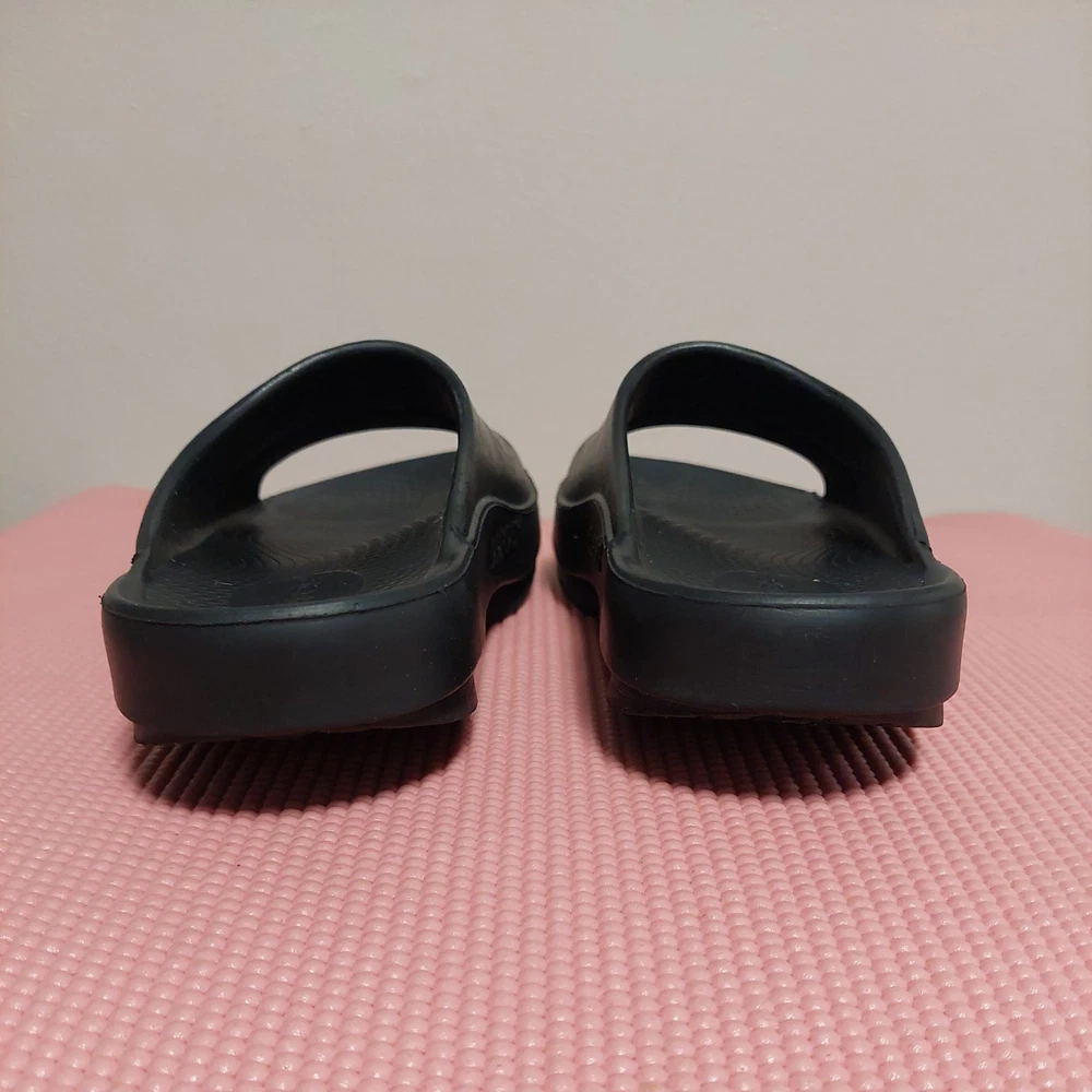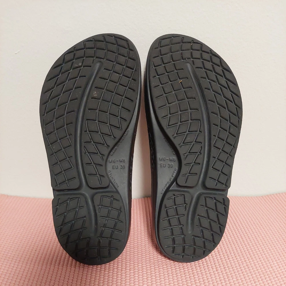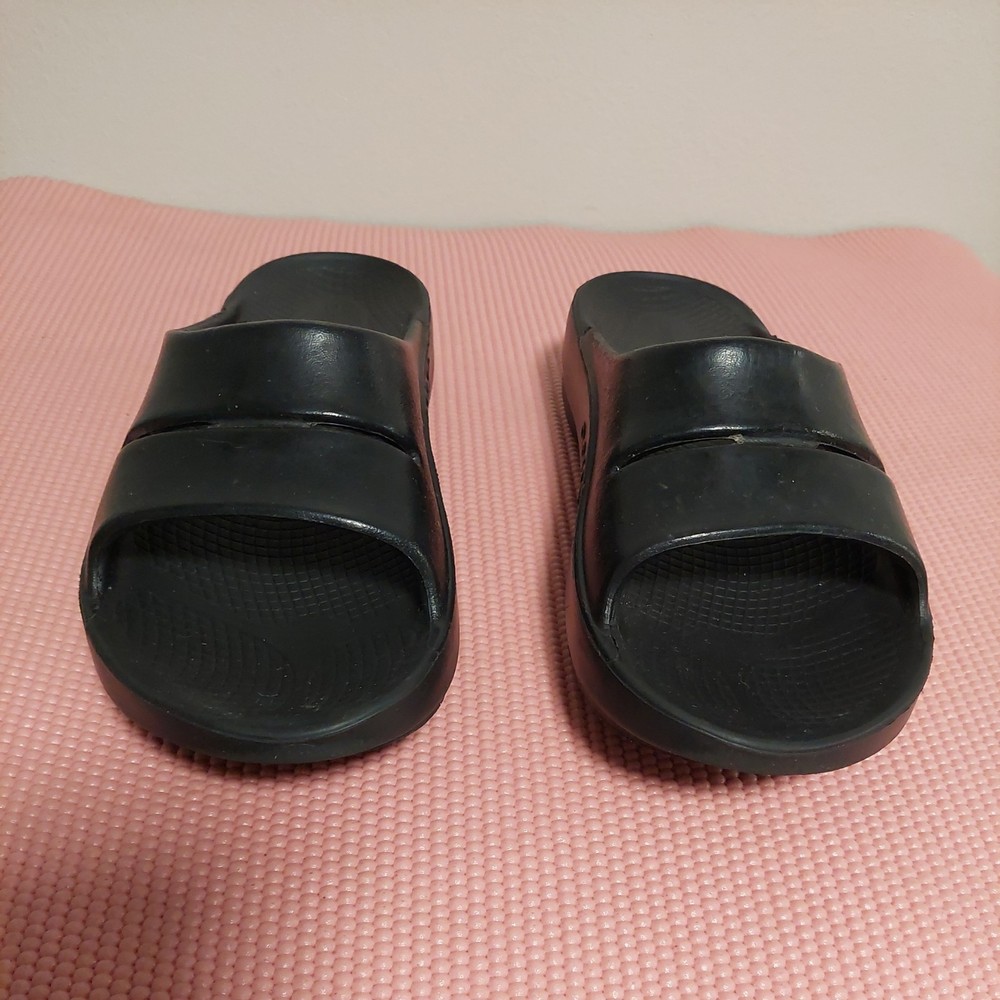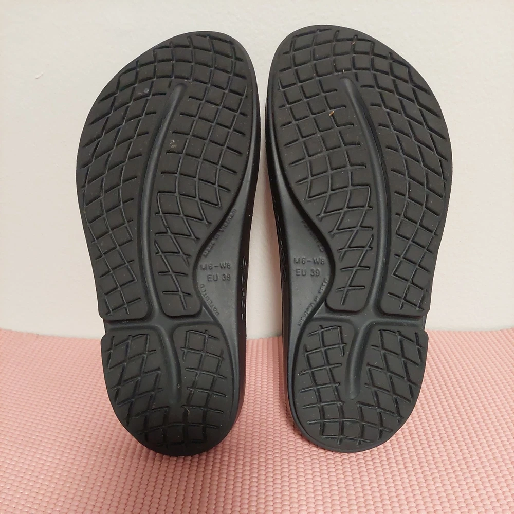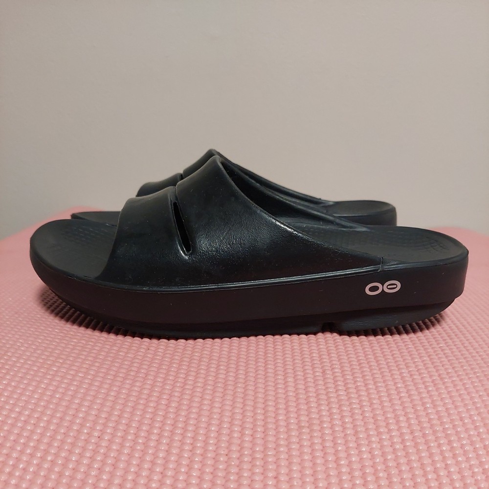 The Oofos OOahh Slide Sandal in men's size 6 (women's size 8) is a slip-on style featuring a solid black color and a comfortable foam insole. Made with a rubber upper material, these sandals are designed for casual occasions with a focus on providing comfort. The Oofos brand is known for its supportive footwear, making these slides a practical choice for those looking for ease and style in their footwear.