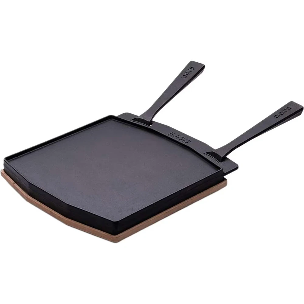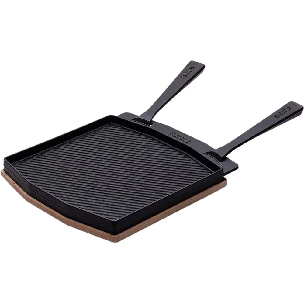 The Ooni Dual-Sided Grizzler Plate is a versatile and durable cast iron cooking tool, perfect for grilling, searing, and griddling a variety of foods. Designed for both indoor and outdoor use, this reversible pan offers exceptional performance, making it ideal for use with Ooni pizza ovens, traditional ovens, or stovetops. Key Features: Dual-Sided Design: Grizzler Side: Features raised ridges perfect for grilling meats, fish, and vegetables with grill marks. Flat Griddle Side: Smooth, flat surface ideal for cooking pancakes, eggs, and delicate foods. Premium Cast Iron Construction: Made from high-quality cast iron for excellent heat retention and even cooking. Pre-seasoned for a natural, non-stick surface that improves with use. Reversible and Versatile: Simply flip the pan to switch between grilling and griddling, allowing you to cook a wide range of dishes. Ideal for pizza ovens, stovetops, and conventional ovens. Removable Handle: Features a detachable handle for easy storage and safe handling during use. The removable handle makes it easier to place in the oven or move the pan around without burning yourself. Oven Safe: Designed to withstand high temperatures, making it perfect for use in Ooni pizza ovens, conventional ovens, or over an open flame. Easy to Clean and Maintain: Pre-seasoned with vegetable oil, requiring minimal care. Simply hand wash with warm water and reapply oil to maintain its non-stick surface. Specifications: Material: Pre-seasoned cast iron Dimensions: 13" x 9.4" (33 cm x 24 cm) Use: Compatible with Ooni pizza ovens, stovetops, and traditional ovens Handle: Removable for easy storage Oven Safe: Yes, up to 500°F (260°C)