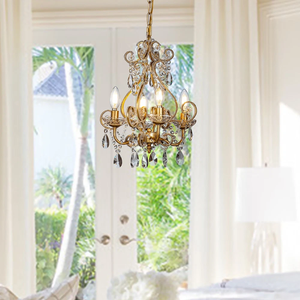 Open Box 4-Lights 13" Small French Crystal Chandelier in Antique Gold
