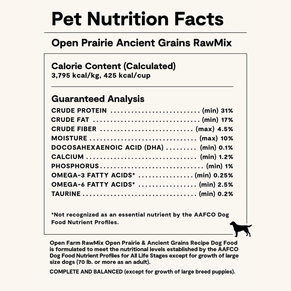 Open Farm, RawMix Dry Dog Food with Ancient Grains, 20 Pound (Pack of 1) Description Features: HUMANELY SOURCED POULTRY - Crafted with a blend of 100% animal welfare certified chicken and turkey, this flavorful recipe includes nutrient-dense meat, organ, and bone with non-GMO grains, fruits, and veggies. RAWMIX - These recipes offer pet parents whole-prey, meat-focused, nutrient dense, kibble recipes with the added benefits of bone broth and freeze dried raw. These diets include meat, organs and bone broth, and deliver optimal taste and nutrition for your pet! REWILD YOUR DOG’S BOWL - Perfect for pet parents that are seeking to feed animals as they thrive in the wild, with protein-focused diets, and the convenient, added nutrient of freeze-dried raw. For those pet parents curious about raw nutrition, but not yet ready to fully switch to raw, RawMix is a great option for your furry friend. QUALITY & SUSTAINABLE PRACTICES - At Open Farm we believe that great nutrition is rooted in the integrity of our ingredients. All of the meat, organ and bones included in these recipes are sourced from 3rd party animal welfare certified farms. By working exclusively with farmers who share our commitment to exceptional quality and sustainable practices, we can make better food for your pets, while also doing some good for family farms, farm animals and the environment. 100% TRANSPARENCY: As a part of our commitment to transparent sourcing practices, we provide owners with the ability to trace the origin of every ingredient using the lot number on the bag, because where pet foods come from shouldn’t be a mystery. Product Details: Handling We will ship all orders within 1 business day of payment. Delivery We Do Not Ship Outside of the Continental US. Return Policy All items qualify for returns within 30 days of receipt. Buyer is responsible for return shipping on any item that is not damaged. Feedback We take our reputation seriously, we buy and sell online, so we understand the value of trust. If you are unsatisfied with your order, please contact us and we will work with you to resolve it to your satisfaction.
