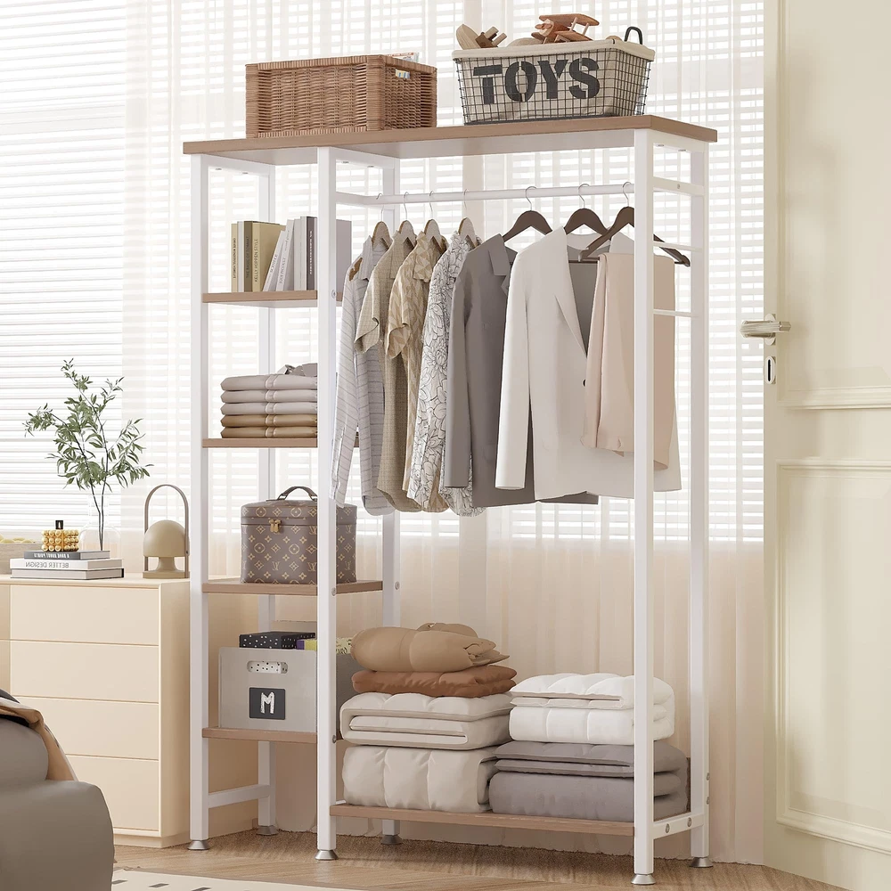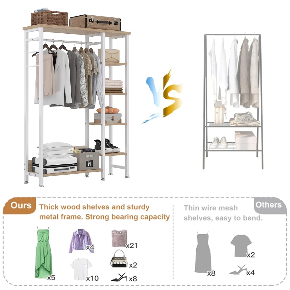 [Strong Weight Capacity] - Heavy duty metal frame paired with thick MDF board makes it super stable and sturdy, without wobble and collapse. Load capacity up to 350 lbs. Ideal for being a long-term wardrobe rack. [Ample Storage Space] - Features 2 large shelves and 4 small shelves, this freestanding closet provides enough space to place clothes, accessories, bedding, shoes, large luggage, etc. The garment rod can hold up to 70 lbs. It is great for hanging coats, pants, shirts or other heavy clothes without worrying about deformation. [Perfect Size for Small Space] - The compact design is suitable for any narrow corners of your home without taking up too much area. Ideal garment rack with shelves maximizes storage space. [Practical & Stylish] - With its rustic brown finish and matte black frame, this clothes rack with shelves will easily bring a charming vintage free to your bedroom, living room and apartment. 3-in-1 practical design allows you to easily access and match clothes and shoes. Keep your home tidy without losing style. [Easy to Assembly] - All the parts and hardware have number stickers, you just need to correspond the number with the instruction, clothing rack with shelves will be easily assembled. You can also get help by watching assembly video on the product page.