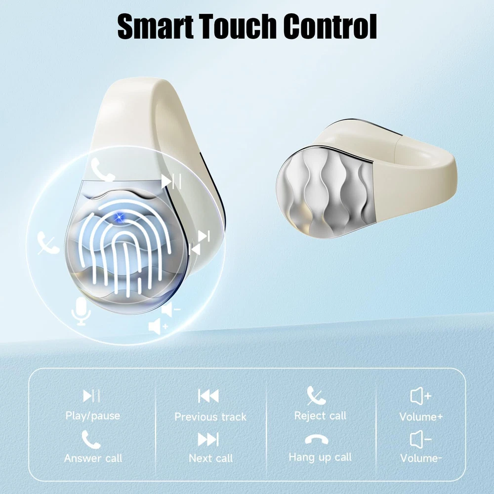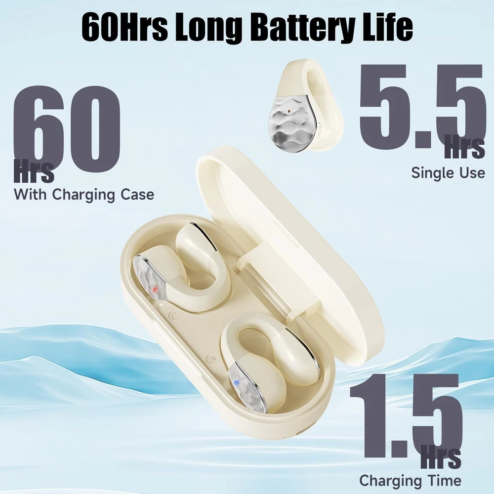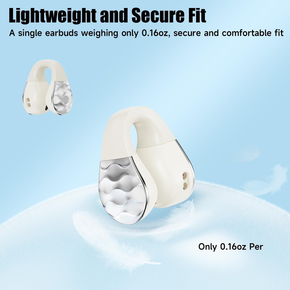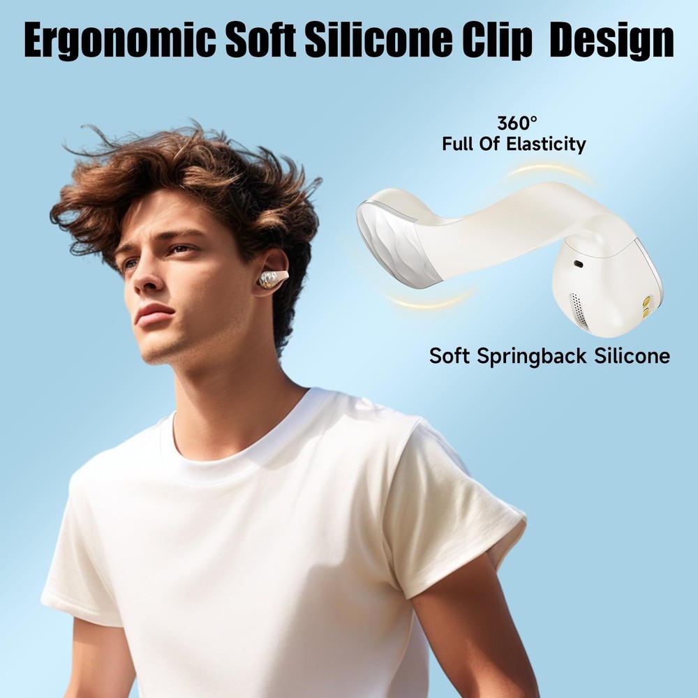 Superior Sound Quality: Featuring 11mm speaker drivers and an in-ear structure, our earphones deliver hi-fi sound with strong bass, clear mids, and bright treble. The large chamber acoustic design minimizes sound loss, ensuring clear audio even in noisy environments. Ideal for music enthusiasts and active individuals alike. Crystal Clear Calls and Seamless Connectivity: With advanced Bluetooth 5.3 technology, our wireless earphones offer stable connectivity and clear call quality, allowing you to stay connected without interruptions. Enhanced Comfort and Style: Our newly designed clip-on earphones combine style with functionality, ensuring a secure fit that's both comfortable and fashionable. Extended Playback and Convenient Charging: Our wireless earbuds come with a sleek charging case that supports 12-15 times full charges, ensuring up to 6 hours of playback on a single charge. The case also features LED display and Type-C compatibility for easy charging. Lightweight and Secure Fit: Engineered with innovative ergonomic design and premium memory silicone, our earphones weigh only 0.17 ounces per unit, providing a stable and comfortable fit for long-term use. Perfect for running, fitness, and outdoor sports.