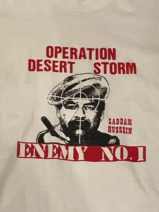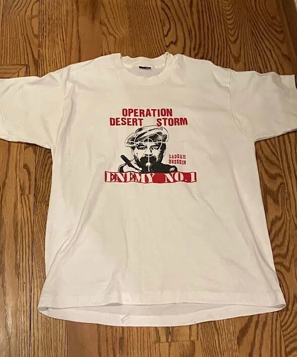 Up for sale is a vintage (1990's) Operation Desert Storm/Saddam Hussein Enemy No.1 extra large shirt. The shirt is original and used. The shirt is in overall good condtion and comes from a smoke and pet free home. There are a few stains on the front bottom of the shirt (see photos).