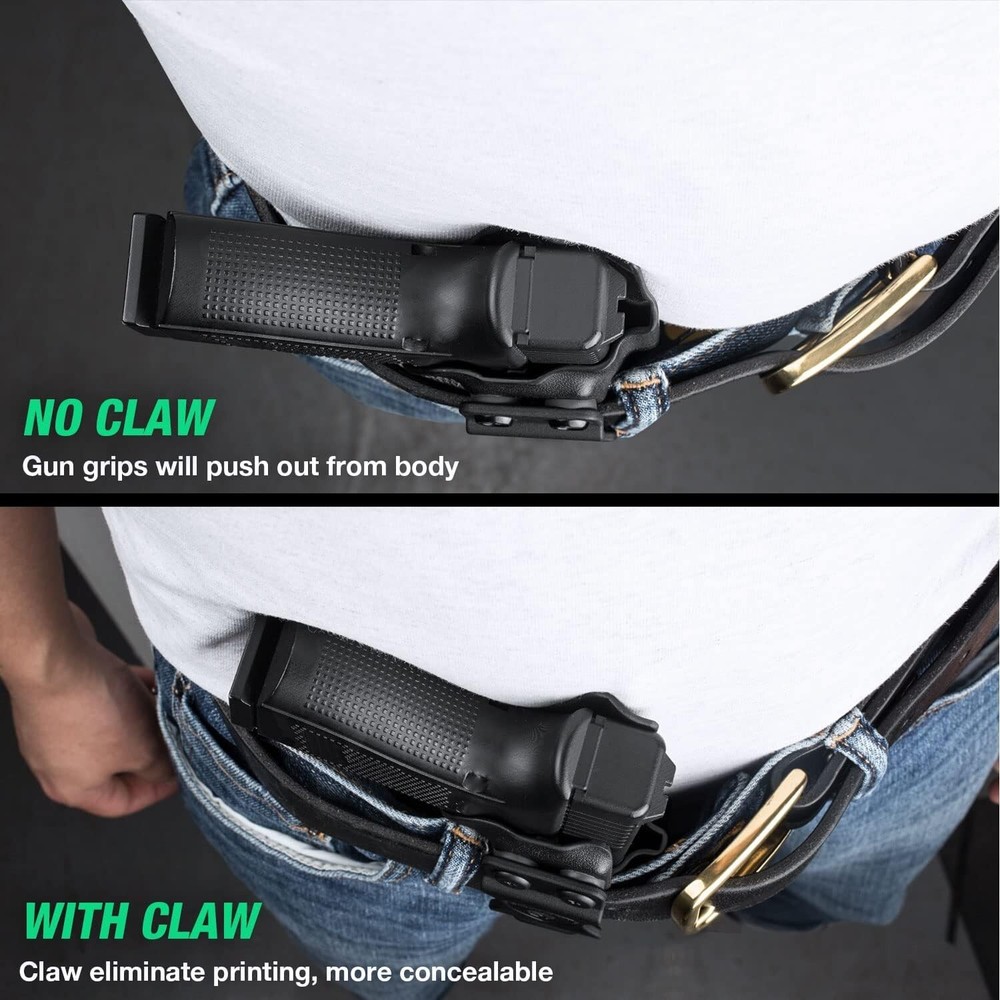IWB Kydex Holster Optic Cut & Claw Compatible with Glock 17/19, G43/43XNo MOS, G2C/G3C, GX4, G3, P320, P365, LC9, Security 9, S&W M&P 9/.40, Shield 9/40, Shield EZ, SD9VE, Hellcat, Right COMPATIBILITY - Compatible with Glock17/19/19X/44/45 Gen(1-5) & Glock 23/32 Gen(3-4) - Glock 17 barrel end would come out from holster inch - Incompatible with Glock 23 Gen 5 & Glock 32 Gen 5 or any Laser/Light OPTIC CUT & CLAW - This Glock 19 holster are designed to accommodate wide variety of optics - Claw can eliminate printing made holster more concealable when carrying(equipped with extra screws for no claw style carry) COMPENSATOR & OPEN MUZZLE CUT - Glock 19 holster can accommodate with various compensators - Over-Cut open muzzle accommodate with threaded barrel FULL LENGTH SWEAT GUARD & POSI-CLICK AUDIBLE SYSTERM - Full length sweat guard can prevent sweat towards your pistol - You can hear a clear "CLICK" sound when firearm was firmly seated INCH US KYDEX MADE - The glock 19 IWB holster is made of .08" (2mm) US Kydex material, which possess rugged, durable, waterproof, washable and lightweight characters - Super suitable for daily concealed carry HAND POLISHED EDGE & SMOOTH INNER STRACTURE - All Kydex holsters edge are polished by hand - Smooth inside structure ensure no scratch nor wear ADJUSTABLE CANT & RETENTION - Adjustable carry angle from -5 to +20 Degrees - Adjustable retention for suitable tightness satisfaction - ALL holsters possess satisfaction, if for any reason you are unsatisfied, please feel free to contact our 24/7 Customer Services for or a resolution of your purchase price, we stand behind the quality of our work!