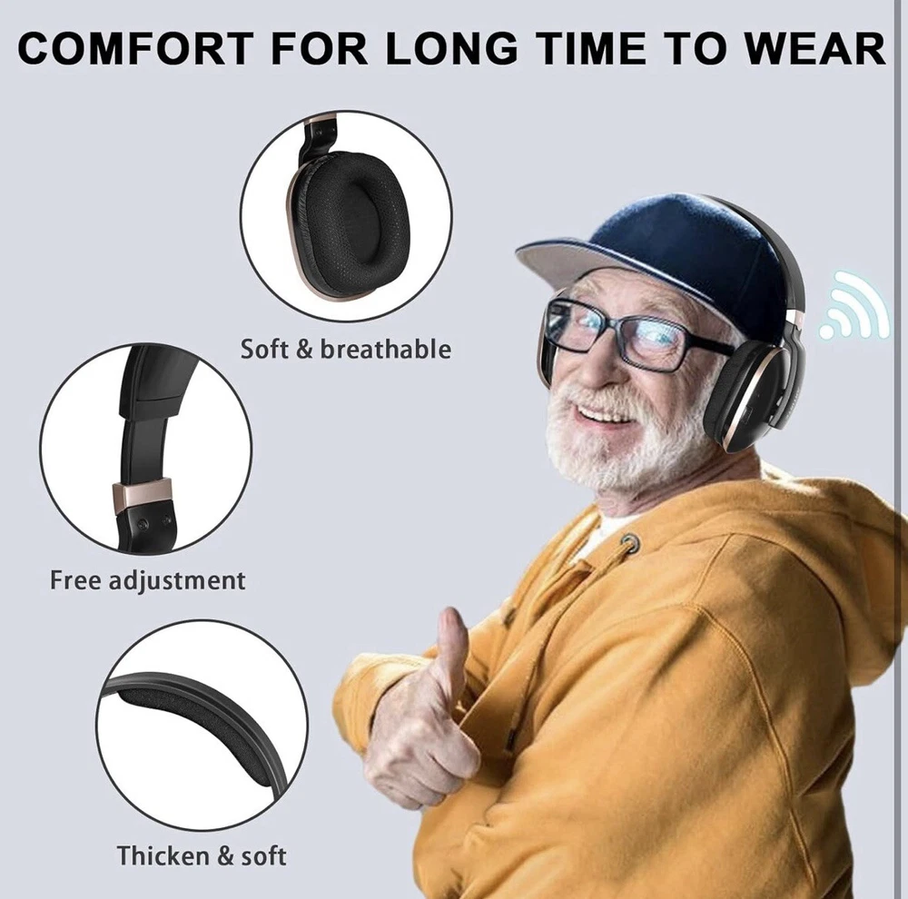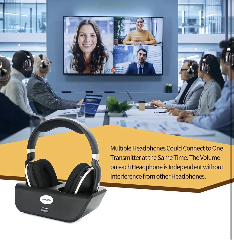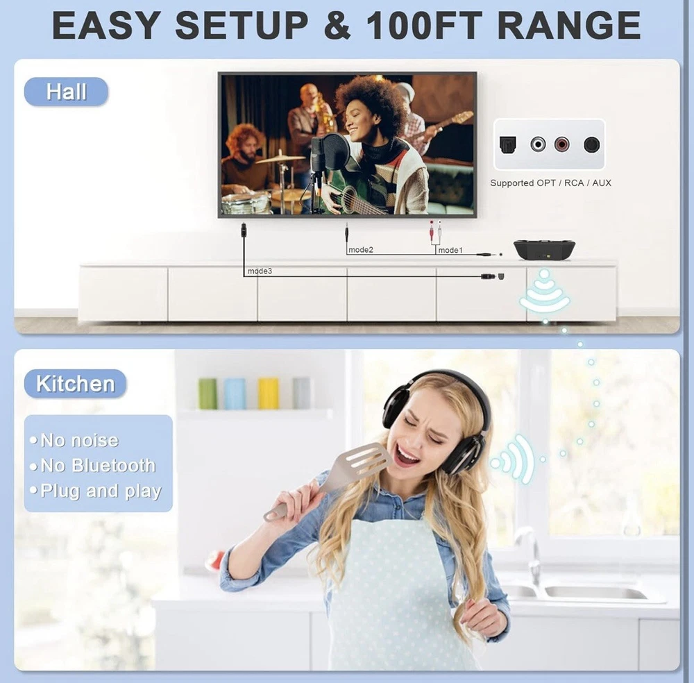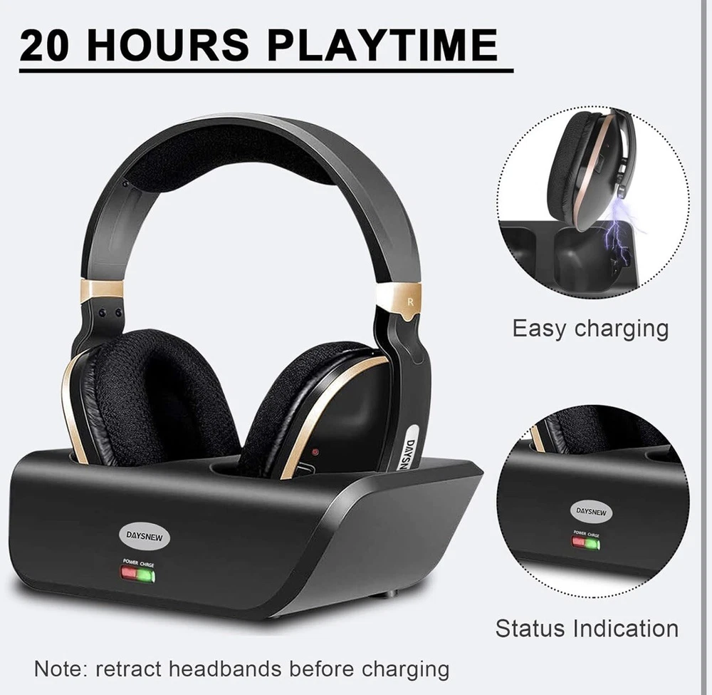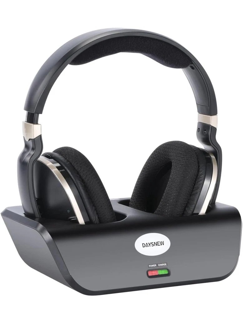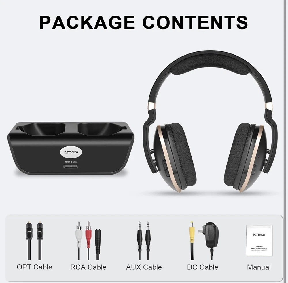 Experience TV at your perfect volume without disturbing others. With this feature, you can enjoy TV at a higher volume while others in the room listen at a normal, lower volume. You can also mute the TV entirely and control your own volume, allowing someone nearby to read or sleep undisturbed. Our ear caps are made from soft, breathable cotton for ultimate comfort and a secure fit, and unlike PU material, they are less prone to cracking over time Enjoy uninterrupted audio even from 100 feet away from the transmitter. Whether you’re downstairs transferring laundry, in the kitchen grabbing lunch, or anywhere else within range, you won't miss a thing. The auto-charging station ensures your headset is always fully charged. Just place the headset in the base, and within a few hours, it's ready to use, providing up to 16 hours of listening time. The package includes all the necessary cables for easy connection to various audio devices. Just plug one wire into the back of the TV, and within seconds, it’s ready to go. The TV’s normal sound will still play, while you enjoy the adjustable volume through your headphones.