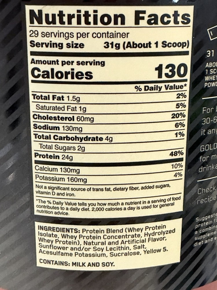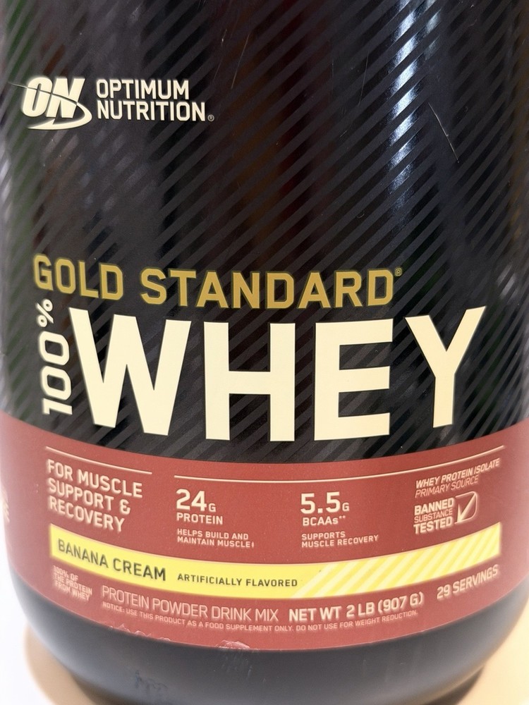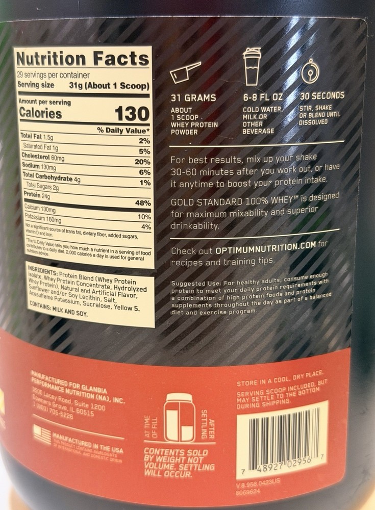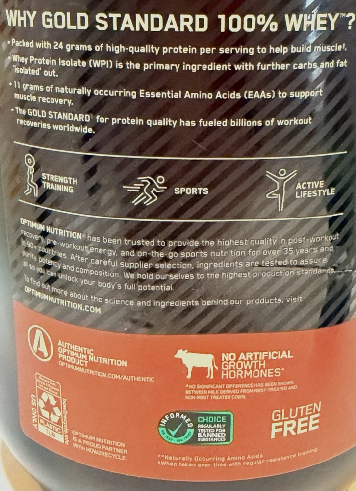 The World's Best-Selling Whey Protein Powder. 24 Grams of Protein per Serving to promote muscle strength and repair. 5.5 Grams of Naturally Occurring BCAAs per Serving to Support Endurance and Recovery. Gluten Free. Banned Substance Tested in accordance with the Informed Choice certification. For Muscle Support & Recovery 24 g Protein - Helps Build and Maintain Muscle 5.5 g BCAAs** - Supports Muscle Recovery Artificially Flavored Whey Protein Isolate - Primary Source 100% of The Protein From Whey Protein Powder Drink Mix No Artificial Growth Hormones^ Authentic Optimum Nutrition Product Gluten Free Informed Choice, We Test You Trust Regularly Tested for Banned Substances Strength Training Sports Active Lifestyle Why Gold Standard 100% Whey? Packed with 24 grams of high-quality protein per serving to help build muscle. Whey Protein Isolate (WPI) is the primary ingredient with further carbs and fat “isolated' out. 11 grams of naturally occurring Essential Amino Acids (EAAs) to support muscle recovery. The Gold Standard for protein quality has fueled billions of workout recoveries worldwide. Optimum Nutrition has been trusted to provide the highest quality in post-workout recovery, pre-workout energy, and on-the-go sports nutrition for over 35 years and in 90+ countries. After careful supplier selection, ingredients are tested to assure purity, potency and composition. We hold ourselves to the highest production standards, all so you can unlock your body's full potential. Gold Standard 100% Whey is designed for maximum mixability and superior drinkability. **Naturally occurring Amino Acids When taken over time with regular resistance training. ^No significant difference has been shown between milk derived from rbst-treated and non-rbst treated cows.