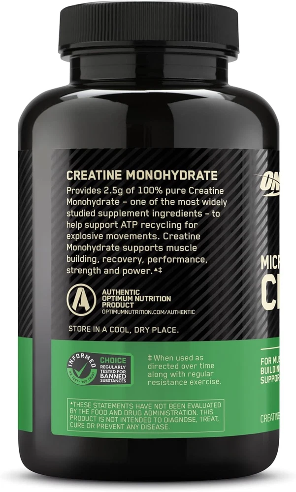 2.5G PURE CREATINE MONOHYDRATE PER SERVING SUPPORTS MUSCLE SIZE, STRENGTH, AND POWER when combined with high-intensity activities CONVENIENT CAPSULES – 2-cap serving size makes taking creatine quick and easy without the need to mix a powder into a liquid EASY TO SWALLOW CAPSULES Optimum Nutrition is the World's #1 Sports Nutrition Brand. Banned substance tested - Highest quality control measures so you feel comfortable and safe consuming the product Optimum Nutrition, Inc. (ON) is part of Glanbia, a leading international cheese and nutritional ingredients group. ON owns and operates two premium sports nutrition brands, Optimum Nutrition and American Body Building (A.B.B.). Together, these brands provide active adults around the world with a comprehensive line of powdered, bar, tablet, capsule and ready to drink products.