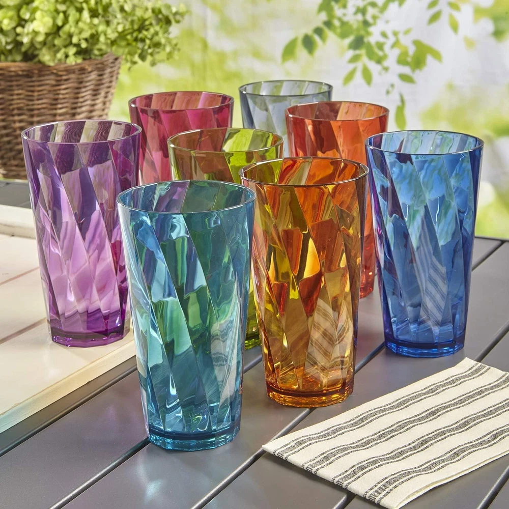 Optix Plastic Reusable Drinking Glasses Set of 8 20oz Water Cups in Jewel Tone Colors | BPA-Free Tumblers, | Top-Rack Dishwasher Safe Elevate your drinkware collection with our American-made 8-piece set that includes eight 20 ounce glasses. Made from high-quality plastic material that's free of harmful chemicals, our cups provide a reliable option for you and your party guests. These cups feature 8 brilliant rainbow colors, a stylish twist pattern, a smooth top edge for easy sipping, and a thick base that provides a glass-like appearance, making them both comfortable and stylish. This design will add an updated look to your kitchen aesthetic. Think outside the house- This Optix plastic glass set is a great addition to any college dorm room, first apartment, rv, and camper. Consider adding these as a wedding registry gift for a new household. Stock your home bar for cocktail hour or prepare for morning breakfast, brunch, and dinner with this selection of highball tumblers. Entertain outdoors on the patio, pool, or hot tub with these durable and shatterproof pieces. The 20 fl. oz. cups (" diameter x 6" tall) are versatile and suitable for any drinkware need. Elevate Your Drinkware Experience Enjoy the convenience and durability of our American-made plastic tumblers, perfect for everyday use or special occasions. Shatterproof and dishwasher-safe, these versatile glasses are a must-have for any home.