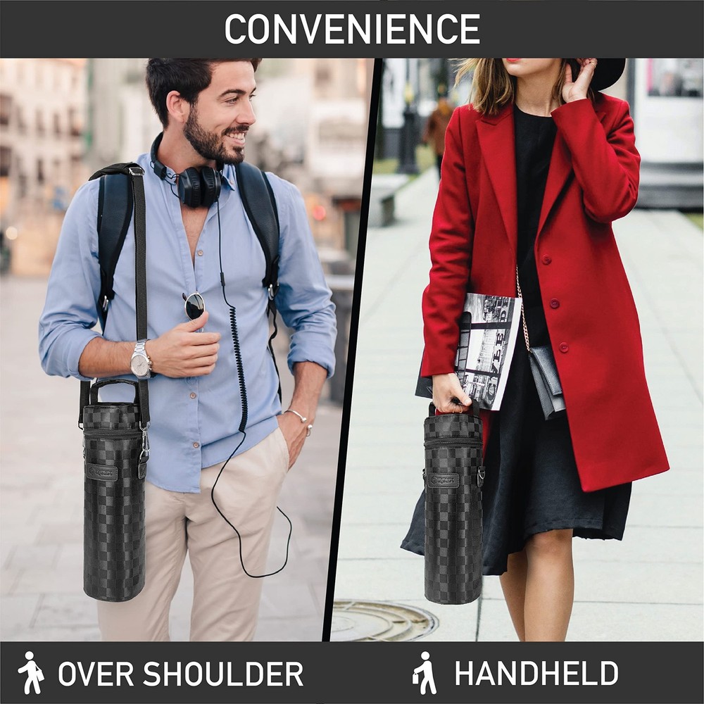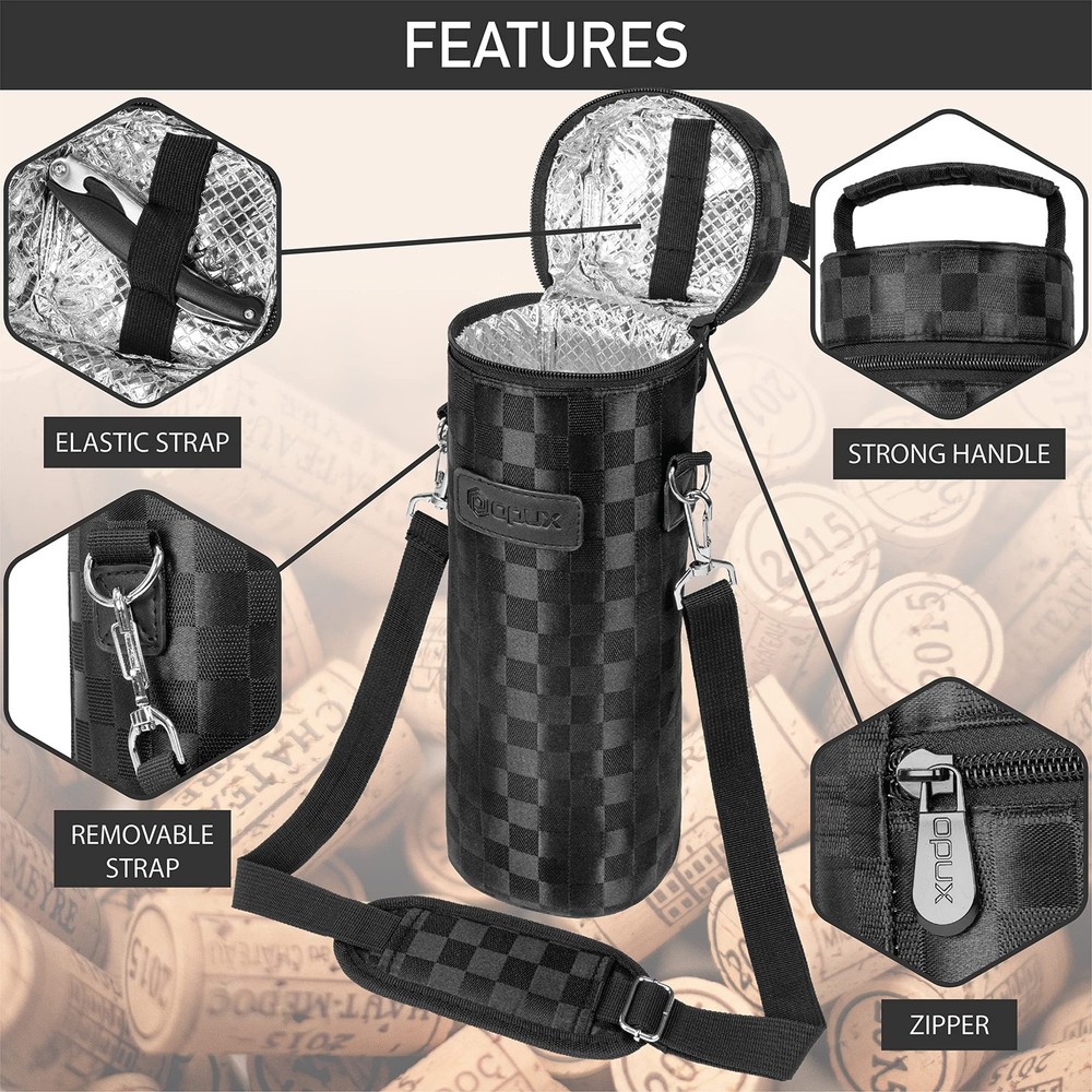 OPUX Premium Insulated One Bottle Wine Carrier Bag with Adjustable Shoulder Strap and Zipper, Reusable Soft Wine Cooler Tote for Travel Beach Picnic Wine Gift for Women Men Perfect for carrying wines with you while you're eating at a restaurant or a picnic, this Premium Insulated 1 Bottle Wine Tote Carrier by OPUX is equipped with a removable shoulder strap and zipper closure for easy opening. This wine tote carrier allows you to store a single standard bottle of wine or champagne It is lightweight and versatile, making it perfect to carry to any special occasion. This Premium Insulated 1 Bottle Wine Tote Carrier by OPUX measures 14 x 4.5 x 4.5 (H x L x W). OPUX creates quality products for your many lifestyles. Our Vision To provide premium kitchen and wine products that greatly simplifies your life. We will continue to innovate and bring exciting products to market so you can achieve more in life! Our Products At OPUX, we offer an extensive line of kitchen tools (such as salt & pepper mills), lunch bags, and wine bags/accessories made of highest quality for all occasions. Our products are meticulously designed with materials and functions that truly simplify your life so you can focus on creating your favorite meals or entertaining your guests. WINE BAG CARRIER 1 BOTTLE: Single bottle wine tote with shoulder strap and zipper is the perfect wine bag for travel, picnic, take to the beach, transport wine, camping, outdoor concerts, restaurant, BYOB, dinner, BBQs, gatherings, or party. Reusable portable one bottle wine holder is insulated and is an essential accessory for traveling, wine gift basket for women, men, and wine lovers, drinker. Celebrate special occasions or getaways with your loved ones with a chilled bottle of wine! INSULATED WINE COOLER TOTE: Thermal insulated wine bag regulates temperature to keep your wine bottles chilled for hours. Perfect wine cooler beach bag for picnics, camping, and road trips. Wine side bag briefcase features 3 layers of insulation and zippered close secured top to maintain a steady temperature weather its chilled, room temp, or frozen for liquor bottles/beverages. Soft wine cooler with zipper is easy to clean and a picnic essential with soft leakproof lining that prevents spills. WINE BOTTLE PROTECTION PURSE: Portable wine carrier bag is perfect for protecting your wine while transporting wine for travel, BYOB to restaurants, wine tastings, beach outdoor trips. The padded protective lining protects your glass bottle from breaking during car travel and comes with an adjustable shoulder strap for comfort. Wine holder bag can be used as a wine suitcase briefcase for airplane air travel. Our wine cooler bag is the best way to ensure your wine is stored properly. WINE GIFTS FOR WOMEN WINE LOVERS: A perfect wine accessory or vino gift for wine enthusiasts, sommeliers, and wine drinkers. Great gift set idea for wine lovers, women, family, friends and father during Christmas, Valentines Day, Anniversary, Fathers day and Birthday. The wine carrier is also a timeless holiday present for mom, coworkers, adult couples during weddings, housewarmings, engagements, bridal shower, hostess, secret santa, white elephant and gift basket swap. PREMIUM PICNIC WINE CHILLER: OPUX premium insulated one bottle wine tote carrier measures 14 x 4.5 x 4.5 (H x L x W). | Fits most standard 750ML wine bottles. Made from high-quality 600D polyester to ensure maximum durability and PU leather trim for a touch of elegance. Zipper secured closure with adjustable removable shoulder strap and top handle for convenience. Classy wine bag set also carry other alcohol bottles such as liquor, champagne, spirits, drinks, beer, and wine glasses.