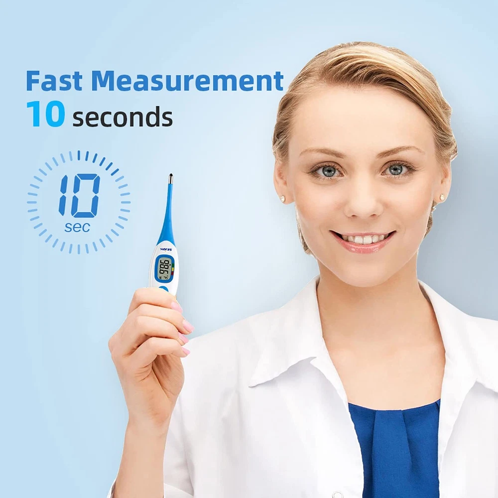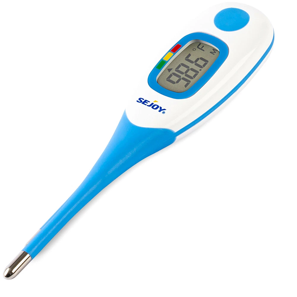 Product Description Sejoy - Professional Manufacturer for 20 years in Medical Sejoy focused on Personal Healthcare, Clinical Diagnosis and Mother and Baby care. We aim to help you to know your temperature at home in a more easier and comfortable way. We want to be your support when fever hits or basal body temperature tracking. Sejoy started manufacturing healthcare medical devices since 2002 , we focused on blood pressure monitors, thermometers, blood glucose monitors and other customerized home-care products. At this moment we have over 1500 workers working with automation equipments and semi-automatic equiment. All products are 100% inspected before shipment. With nearly 20 years production experience with automation to ensure quality consistency, and skilled R&D for keep improving. The quality and accuracy is tested by our clients all over the world. We warmly invite you to be one of our beloved customer. Fever Alarm This is a simple thermometer for kids and adults,no more memoring the fever temperature, you can tell whether the temperature is high or not just by looking at the color bar which the arrow points to.Like traffic lights. Recall Last Reading This termometro digital adults and kids, allows you to check your last reading result, so you can track the temperature curve and see if the temperature getting better or not. Finish Beep According to customer feedback, the finish Beep is a little soft as we don't want this to be loud to be annoying, you may need to pay a little more attention to this. Normally the buzzes are “ Bi-Bi-Bi-B i-”; Alarm beeps more rapidly when temperature reaches 100.0℉ (37.8 ℃) or higher ,and the buzzes “ Bi-Bi-Bi----- Bi-Bi-Bi------- Bi-Bi-Bi” Features of Sejoy Thermometers How do Sejoy digital thermometer reads the temperature in 5-10 seconds The thermometer will enter into the Actual Measurement after 3 minutes. You will get your real temperature besides the previous predictive temperature. One Press On The Digital Thermometer To Start Measuring 5s Fast Reading & High Accuracy: This digital thermometer provides accurate, simple to understand readings in only 5-10 seconds, so you can get results quickly. It also has a memory feature that recalls and displays last temperature taken, help track the temperature change. Easy to Read and Fever Alarm : The three-colour color-bar Fever In Sight printed on the thermometer helps understand temperature easily. Arrow on the display Points at green suggests a normal temperature, yellow signifies an elevated temperature and a red display indicates a high temperature. Digital thermometers provide fast, easy to read temperatures so you can tell if you or your child has a fever quickly and accurately. Versatile: With 5-10 second test time, oral,rectal, under arm, bath water mode provided , also equiped with soft silicone tip, reliable stainless steel probe, waterproof design, it is perfectly to be used as thermometer for adults and kids, pets, as baby thermometer, rectal thermometer, water thermometer, dog thermometer. The all in one thermometer for home use. Easy to use and Hygenic: The digital thermometer is waterproof for easy cleaning. Simply clean under the tap with a bit of soap. 10pcs disposal probe covers also included for use as oral thermometersand rectal thermometers, hygienic between use. It comes with a sanitary storage case, a battery, and probe covers, ready to use. Special Features: This digital thermometer is easy to read with larger LCD display, beeper alarm, memory display, auto shut off, easily switch the units between ℉ and ℃. Anything you need , pls kindly contact us through ebay message.("Lo" before testing means it hasn't sensed your temperture,which in other says is it's ready to test, "Lo" has nothing to do with the battery.) All in One Thermometer for Adults, Kids, Babies, Infants, Vets Use as: 1.Thermometer for Adults, Thermometer for kids(termometro digital adults and kids), as well as thermometer for Pets 2.Oral thermometer,rectal, under arm, bath water thermometers, basal body thermometer Q&A for question in the review: 1. Why the color box of the thermometer marked 10s? The actual testing time of the thermometer is from 5-10s, which you can see on the manual inside the boxes and test by practical measurement. As regular markings ,it is 5s or 8s or 10s.For 5s, some may think it is not true ,for 8s, we know it is not the exact time, so we choose to mark 10s, lower the expectations, and provide the actual time less than 10s. Hope that customers could kindly understand. 2. How to switch Celsius to Fahrenheit? ℉/℃ SWITCHABLE:Temperature readings are available in the or scale (℉/℃; located in the upper right corner of LCD.) 1. Turn on the thermometer. 2. During the last measured value displays, press and hold the On/Off button until ℃ or ℉ showes. 3. Quicky press On/Off button to switch between ℃ and ℉ modes. 4. When the desired unit displays on screen, wait for auto entering into measurement mode.