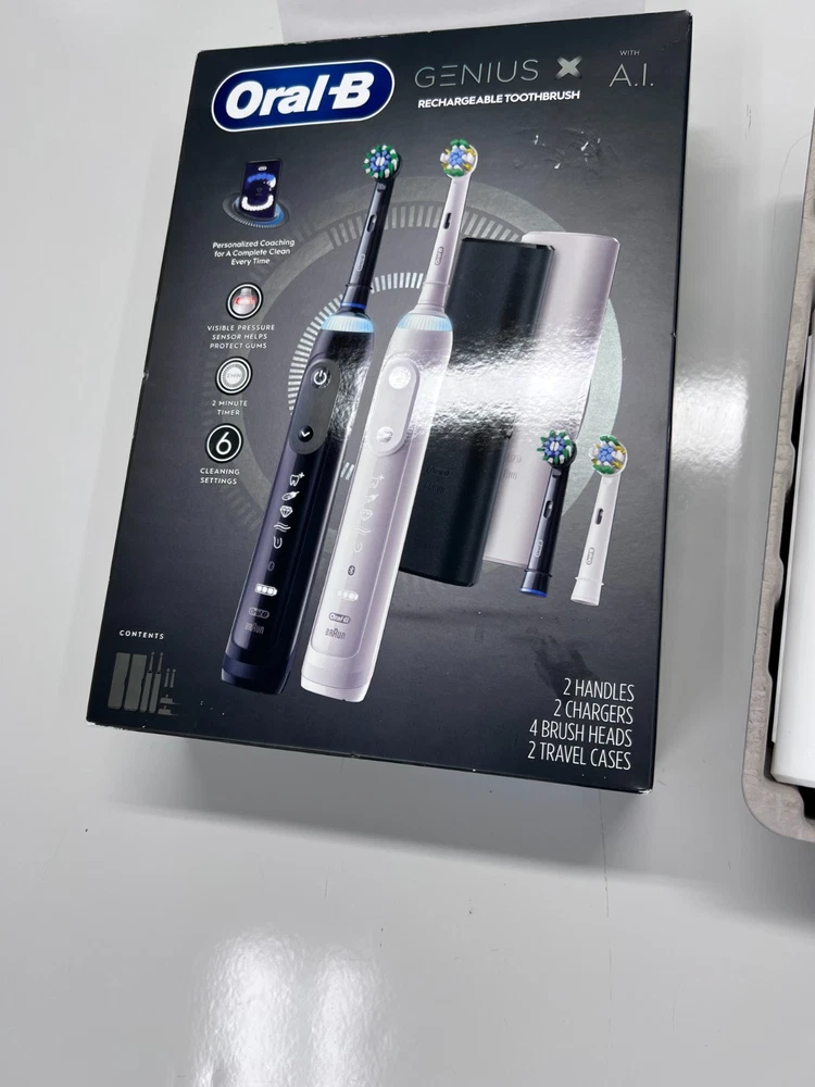 This listing is for ONE (1) Oral-B Genius X AI electric toothbrush taken from a factory 2-pack . The toothbrush is unused , fully functional, and includes original accessories as shown. Powered by AI brushing recognition , the Genius X adapts to your brushing style and helps improve coverage and technique when paired with the Oral-B app. Included: 1× Oral-B Genius X AI electric toothbrush handle 2× Genuine Oral-B brush heads (new, sealed) 1× Charging base 1× Travel case Instruction manual Ships securely in the original inner packaging shown (not full retail outer box)