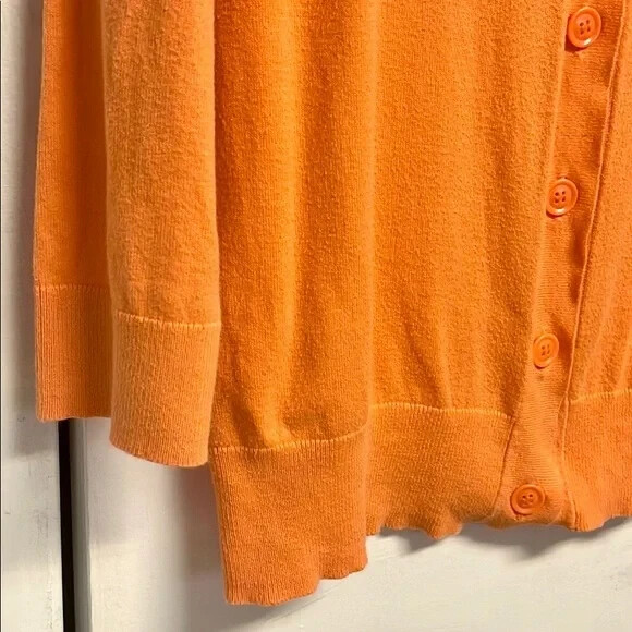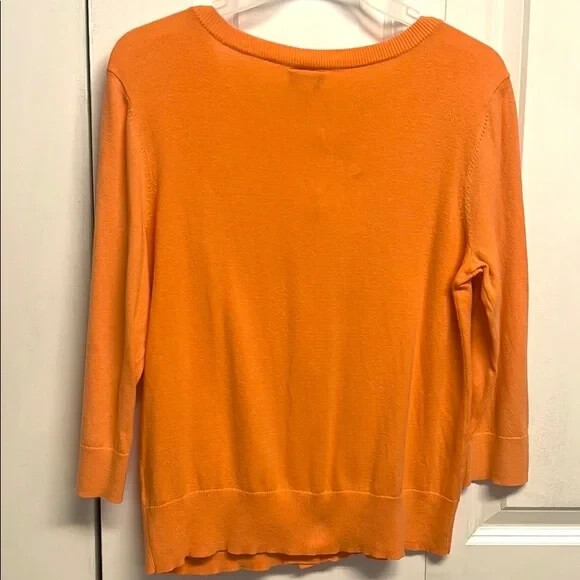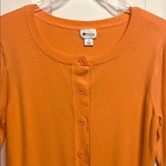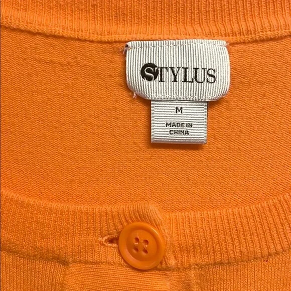 Add a pop of color to your wardrobe with this stylish Stylus top. The orange cotton blend knit fabric is lightweight and breathable, making it perfect for all seasons. The 3/4 classic fitted sleeves and round neckline with button closure add a touch of sophistication to this basic style. The top is easy to care for and machine washable. This versatile button-up top can be dressed up or down for any occasion, from workwear to party/cocktail to casual and travel. The fit is regular and true to size for a comfortable and flattering silhouette. The solid pattern and collarless design with accent buttons make it a perfect choice for the hipster, designer, hippie, princess, punk, colorful, geek, city, classic, hip hop or preppy fashion theme. Made in China. Good Pre Owned Condition 80% cotton 20% nylon Soft thin knit machine washable 17’ across shoulders 18’ long sleeves 18.50’ across chest 33’ around bottom band 23.50’ long from collar seam to bottom front