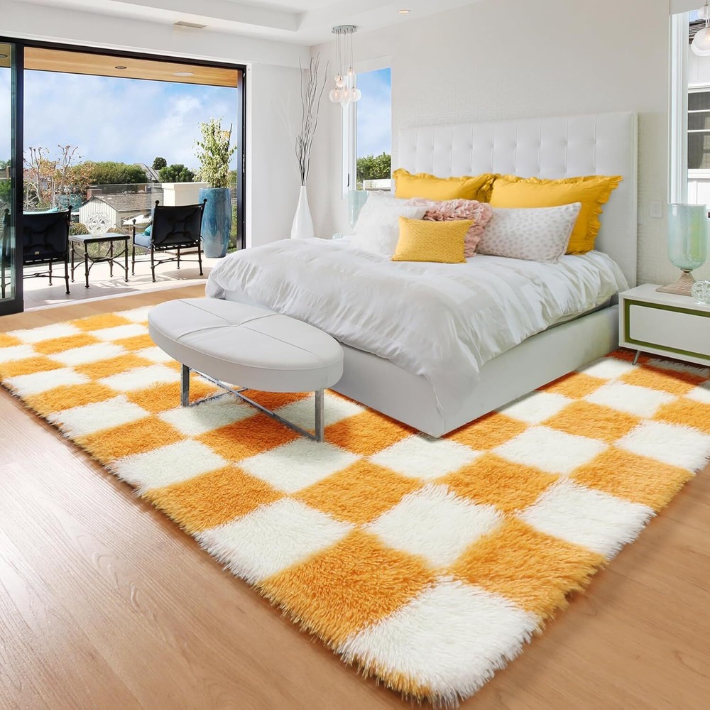 Orange Cream White Fuzzy Checkered 4x6 Rug for Bedroom Living Room