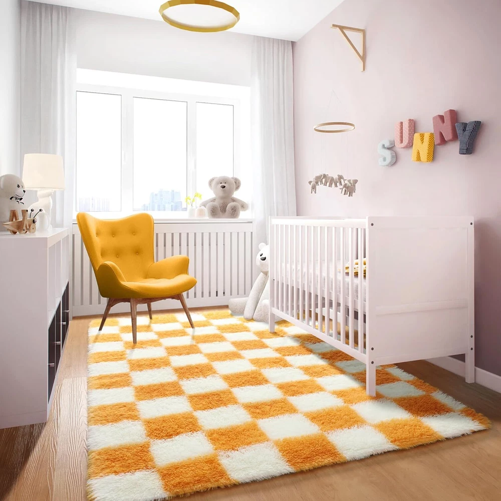 Size: 4x6 Ft Color: Orange / White gtin13: does not apply Room: Living Room, Bedroom, Study Room, Playroom, Nursery Room Back Material Type: Rubber Features: Fluffy, Non-shedding, Ultra Soft, Non slip, Easy to clean Material: Microfiber Is Stain Resistant: No Type: Area Rug Pile Type: High Pile Style: Modern,Minimalist UPC: does not apply Brand: Branded Item Thickness: 1.6 Inches Product Dimensions: 72"L x 48"W - 3.8 pounds Pattern: Checkered Weave: Knitted Construction Type: Machine Made Theme: Checkerboard