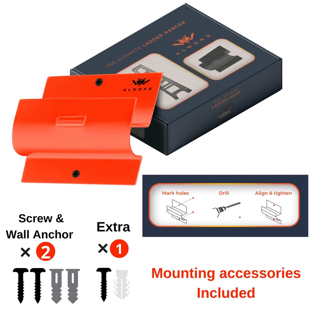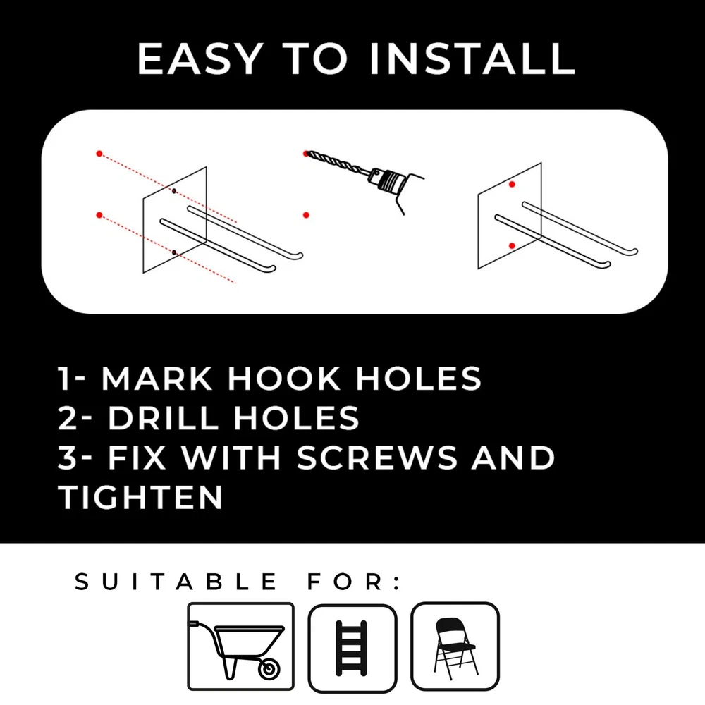 Transform Your Garage with Heavy-Duty Ladder Hooks - Ultimate Storage Solution for Ladders, Tools, and More! Maximize your garage space with our heavy-duty ladder hooks for garage wall. Designed to provide a sturdy and reliable storage solution, these ladder hangers for garage wall are perfect for organizing your garage, shed, or any storage space. Whether you need to bulky ladders, steep stool hanger, folding chairs, or as a wheelbarrow hanger, these versatile ladder hangers for wall keep everything secure and out of the way, allowing you to maintain a tidy and efficient workspace. Crafted from durable materials, our ladder hangers can hold a variety of items, ensuring that your ladders, tools, and outdoor gear are safely stored. The design of these ladder hooks makes installation simple and hassle-free, giving you an instant upgrade to your garage’s organization. Ideal for both professional and personal use, these garage hooks are built to handle heavy loads, making them the go-to choice for anyone needing a dependable storage option. For those seeking the ultimate in strength and reliability, our garage hooks heavy duty are a must-have. Capable of supporting even the heaviest ladders, these hooks are built to last, ensuring your tools and equipment remain safely stored for years to come. Say goodbye to clutter and enjoy the convenience and durability of our premium ladder and tool hooks today! Crafted From The Premium Materials: This ladder hook is made from a premium, higher-grade metal compared to others in the market. The superior and thicker carbon steel is extremely sturdy and durable, for a long-lasting result. Size 5"x4.1"x1.76" Super Versatile & Multi-purpose: Easily use this hook to hang a ladder, or gardening tools like a wheelbarrow. The sleek, low-profile design makes this sturdy wall mount bracket storage hook the perfect option to easily hang folding chairs, a step stool hanger, the drying rack in your laundry or even items in the attic! Claim Back Your Space & Get Rid Of Mess: This multipurpose ladder hanger hook is a storage solution tool that works for any space – the garden shed, garage wall, and more! It can almost anything to help keep your space tidy and safe from trip hazards Simple, Quick & Easy To Install: No difficult instructions or time-consuming installation. This heavy-duty ladder bracket and utility hook takes just minutes to wall mount and is so easy to use as a great storage solution Ideal Gift: for the gardener or messy (or tidy) person in your life who would love to organize their bulky items in a better way. This multi-purpose ladder hanger gives extra space while keeping items easily accessible.