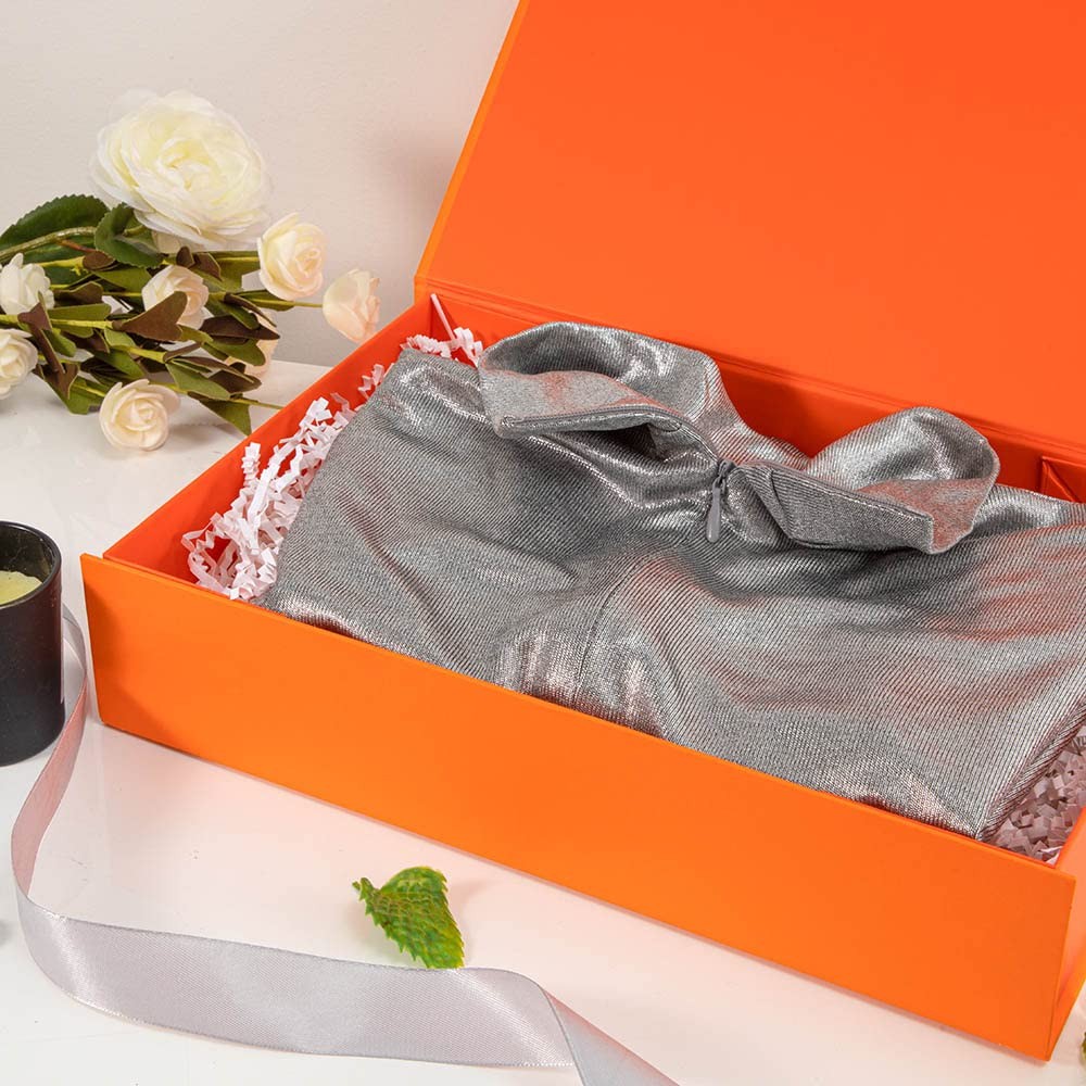 What is the material of the large box? Excellent strength cardboard and wrapped with quality paper and 6 Pairs of Powerful Magnets. We also included 12M Tape in each package for your needs In what ways has our box improved?ssembly and removal will reduce the stickyness of the tape. Our boxes are all assembled and closed directly by magnets. No matter how many times you assemble and disassemble, the magnet's magnetism does not decrease. We upgraded the magnet magnetism to prevent it from not working. We also offer 3M Tape for you to use, So you can permanently secure the four corners of the box with 3M Tape when you don't need to assemble and disassemble it repeatedly What are the advantages of this box? 【Magnetic closure 】 【Durable】 【Easy to assemble】 【Storage】 【Reusable】 【High-quality Hard Board】 The luxurious large gift box Pass your heart and love for him or her. Elegant and easy way to wrap, contain, protect and present a special gift for Christmas, Holidays, Birthdays,Weddings, Easter, Mother's Day, baby showers, Weddings, Anniversaries, Graduations, Housewarmings and so on. gift box with 6 Pairs of concealed magnets can be opened and closed repeatedly,It can also be assembled and disassembled over and over again. 🎁【UPGRADED】 6 Pairs of Magnets Assemble in Second ,Powerful Magnets make the box easier to assemble and disassemble than tape; You can also use free tape that we provide when you need 🎁【WHAT YOU GET】 5PCS Orange Hard Gift Box ,Some Round Transparent Double-sided Tape 🎁【SIZE】 Outside Measure: 12x8x2.5 Inch (30.7x20.5x6.14cm) ; Inside Dimensions: 🎁【Boxes for Gifts】This large gift boxes with lids can hold presents like T-shirt, baby clothing,hankies, scarves, candies, photos, keepsake, jewelry, book and more. Great for festival and everyday packaging for business gifts, Christmas Valentine Thanksgiving Birthday Graduations, Weddings, Father's Day, Mother's Day and more other gift giving occasion. 🎁【AFTER-SALE GUARANTEE】 If you feel our gift box is not not fit for your gift , we offer a 30-Day Money-Back Guarantee. If you have any questions please contact us and we will get back to you within 24 hours. Your satisfaction is our pursuit.