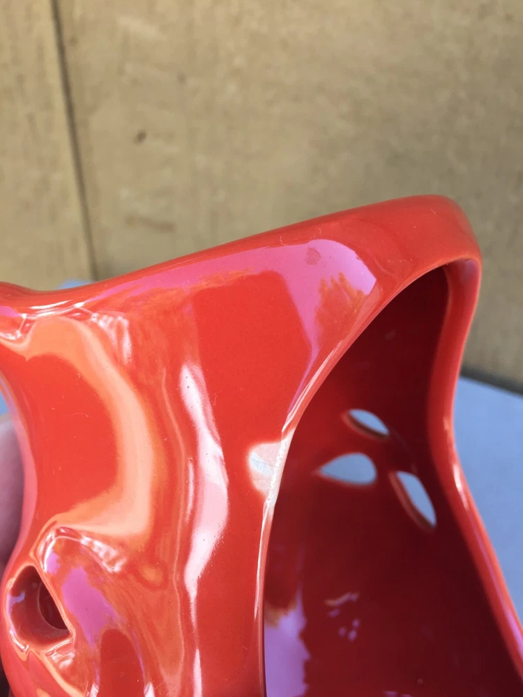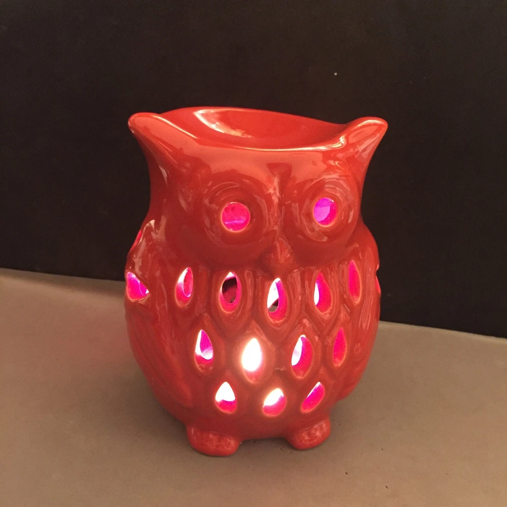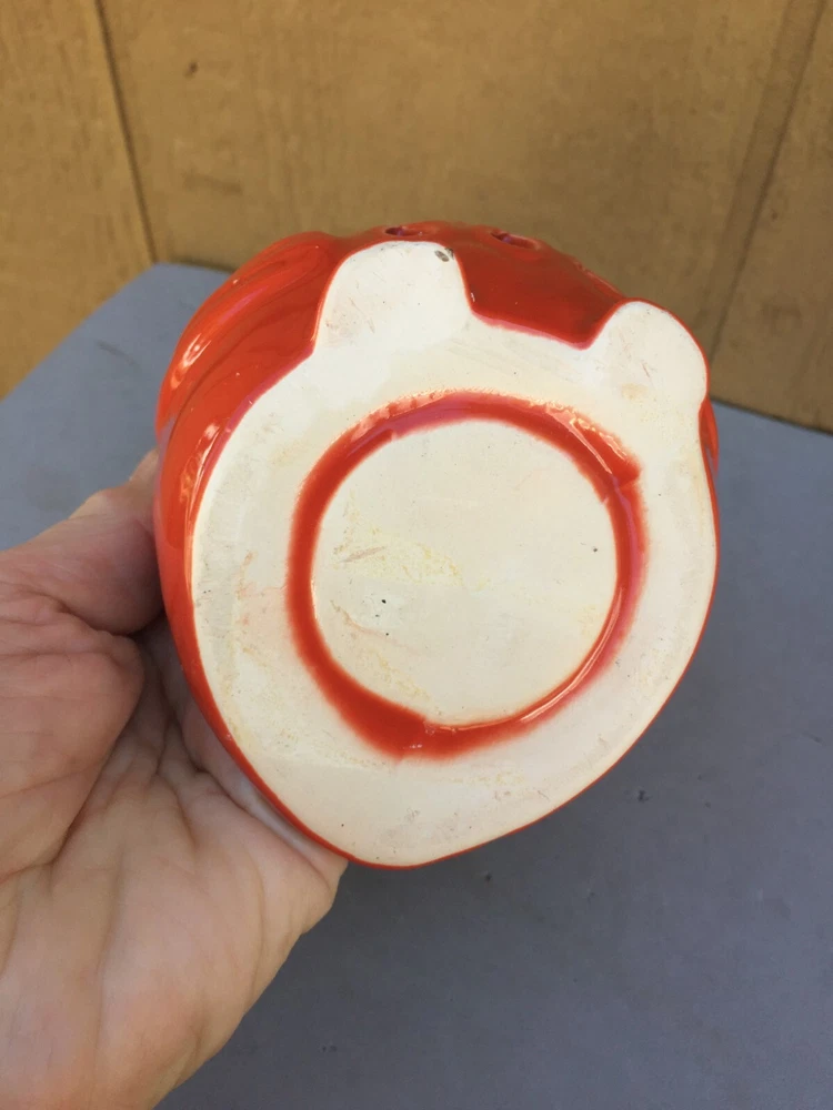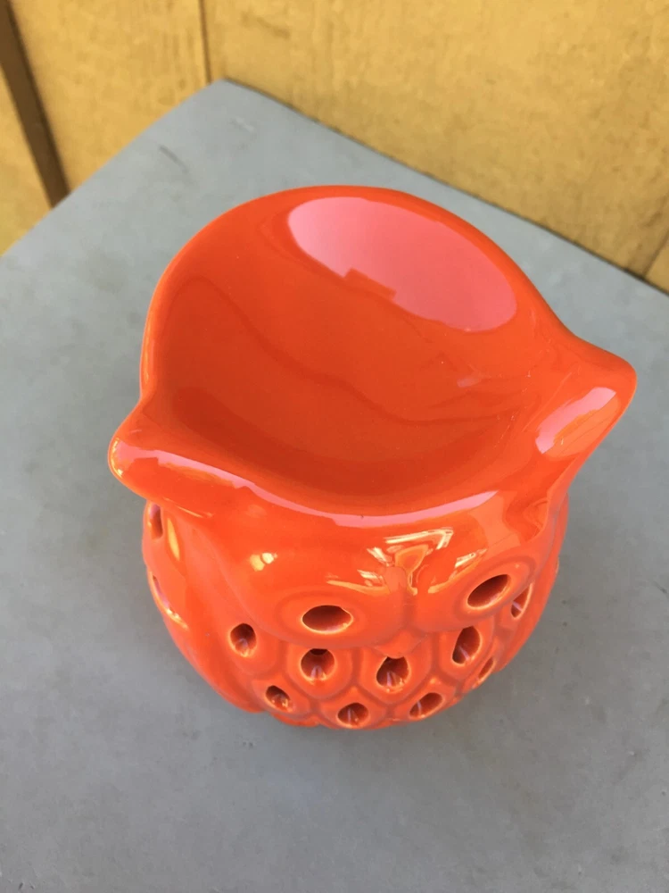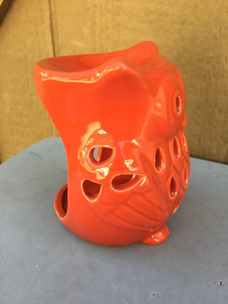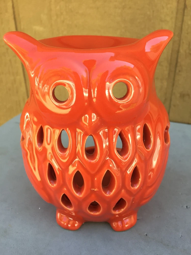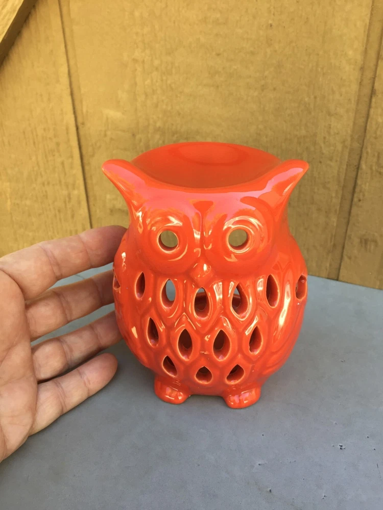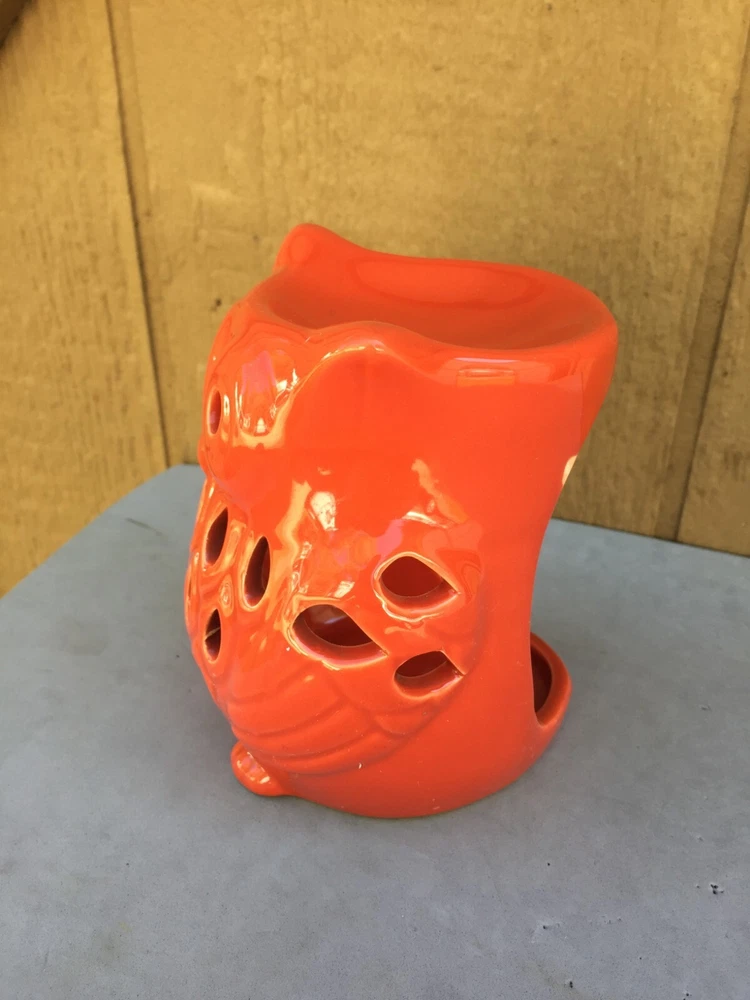 Orange Hoot Owl Ceramic Candle Holder Peek-a-Boo Front Halloween 5" tall Vintage This is a vintage ceramic owl theme candle holder that measures 5" tall x 4" x 4" and feature a Mid-Century Modern style. The front is cut out so the candle light from inside shows. See my last photo showing lit up. The eyes are also open so they light up. There is not a maker's mark. No chips or cracks. There is a glazing flaw where the orange glaze not cover ( on side by back opening where are has white spot). This is a vintage pre-owned item. My photos are of the actual item you are getting. See our store for other interesting items. PAYMENT DETAILS: Buyer must furnish seller with "ship to " address that matches the address registered on ebay. Payment is expected within 3 days after close of auction. SHIPPING DETAILS: If package is less than 13oz it will be sent First Class. If package is over 13oz to 5 lbs it will be sent Priority Mail. If package is over 5 lbs it will be sent Priority Mail or Retail Ground. Book packages less than 5oz will be sent First Class. Book packages over 5oz will be sent Media Mail. We usually ship within 24 hours of payment (weekend & holidays excluded). Please contact us if you prefer another method of shipping. We are happy to combine multiple items to save shipping costs (if items can be put together). RETURNS: Buy with confidence. We provide a money back guarantee if you are not satisfied (minus shipping cost). Prompt return of item insures prompt refund. Items must be sent back within 5 days after return request. Returns must be shipped by an insured carrier. INTERNATIONAL BUYERS: You may qualify for a cheaper rate. We accept only PayPal. If you need more details contact us. Thank you for looking.