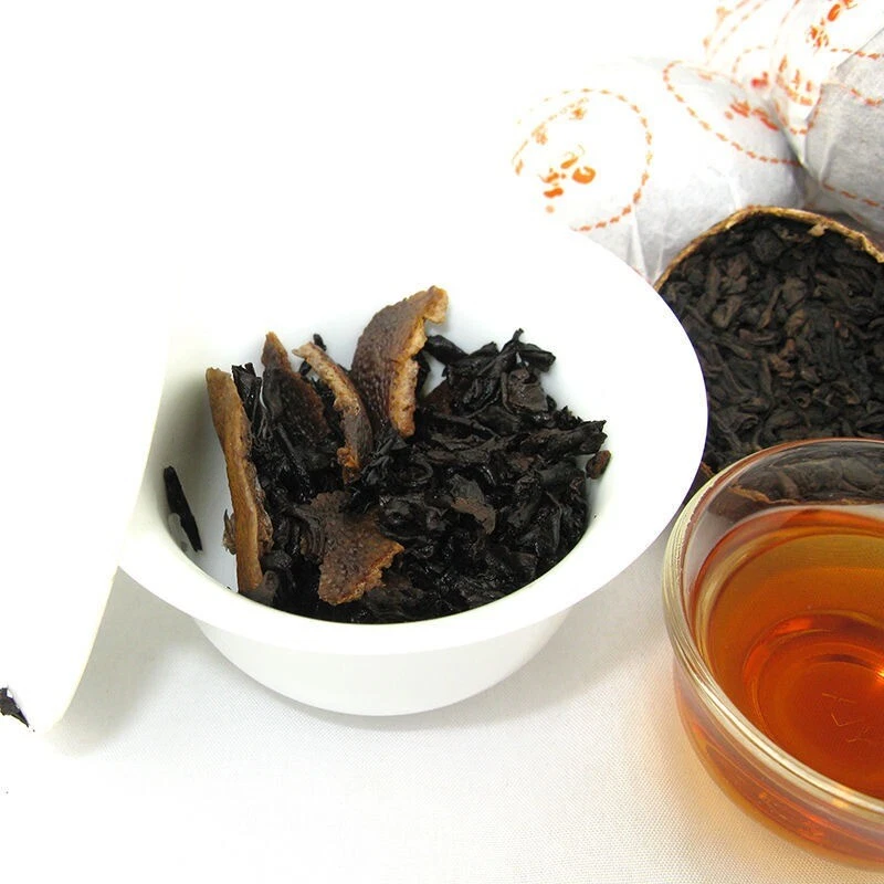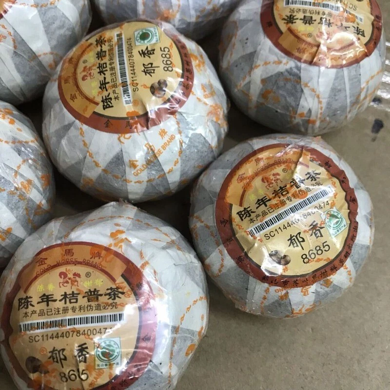 Orange PuErh Tea Yuxiang 8685 Chinese Loose Leaf Ripe Pu-erh Tea Slimming Tea Net weight: About 15g-25g/pc Ingredients:Orange and Puer Ripe Loose Tea Origin:Guangdong,China Manufacturer:Guangdong Heshan City Fruit Tea Science Research Institute.GOLD HORSE BRAND 8685 is labeled as scent of rich flavour. The tangerine wrapped Pu-erh tea was made of large tea leaves harvested in Yunnan, and tangerine produced in Xin Hui, Guangdong, and it had underwent proper aging. Also known as Ju Pu, the pu-erh leaves stuffed into a whole Xin Hui Tangerine Peel. The leaves are packed into the fruit wet, and then dried under the sunlight. After that, the packed tangerine teas are then stored in a cool dry location, allowing the tea to ferment and dry within the tangerine peel. While drying the pu-erh tea absorb the flavor of tangerine. The Gold Horse brand tangerine wrapped Pu-erh tea by Hoshan Tea Institute of Science and Research is famous in China. This tea should be brewed with broken pieces of the tangerine peel included for its taste and medical value, it brews a clear soup, rich in flavor, with smell and taste of citrus. When you brew it is the absence of the heavy musty flavor characteristic of traditional pu-erh. Certainly this character is still there but it is layered beneath sweet notes of tangerine, the result of being packed in the tangerine peel before fermentation. As the tea ages it absorbs the flavor of the peel, the peel and leaf both turn a deep brown.While most pu-erh teas are characterized by musty, earthy tones, tangerine peel packed pu-erh is highlighted by exceptionally light notes of citrus. The infusion is similarly clear tending golden yellow, in marked contrast to the darker infusion of traditional pu-erh.