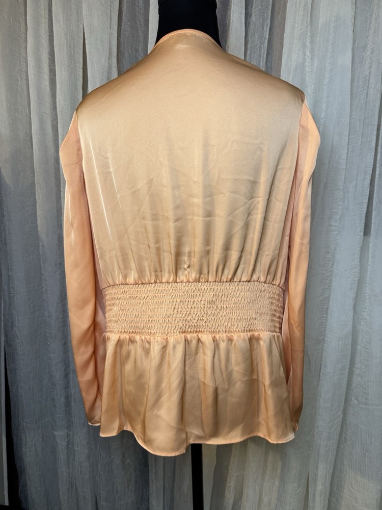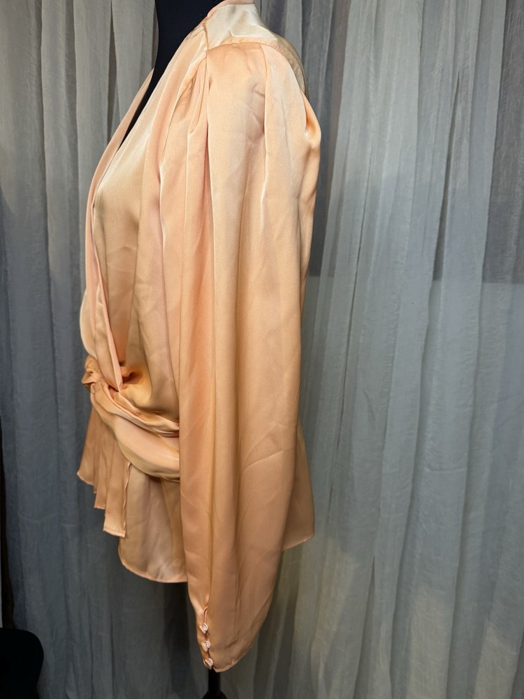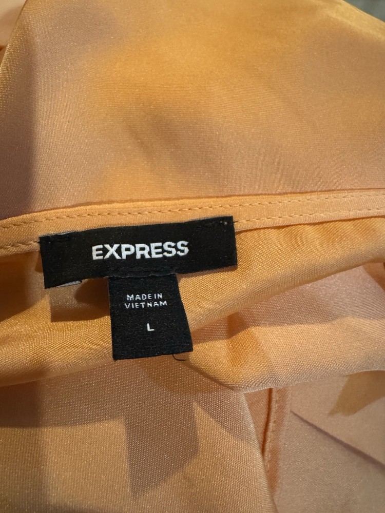 The Express Orange Satin Blouse in Women's Size L is a stylish and versatile addition to any wardrobe. This solid orange blouse features a V-neckline, long sleeves, and a pullover closure, making it perfect for casual occasions in the spring and summer seasons. The polyester fabric and satin finish add a touch of luxury, while the regular fit ensures comfort and a flattering silhouette. Machine washable for easy care, this blouse from the brand Express is a basic yet colorful piece that can be dressed up or down to suit any style. NWOT LENGHT 52 inches