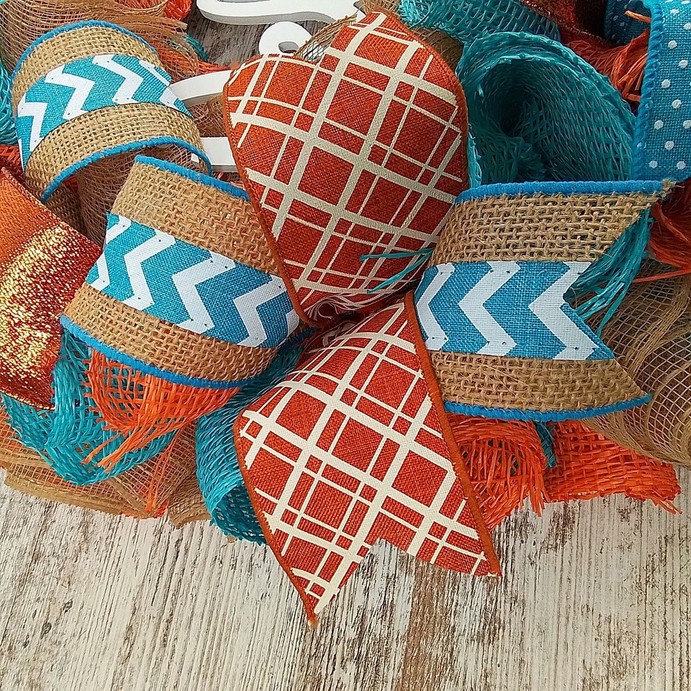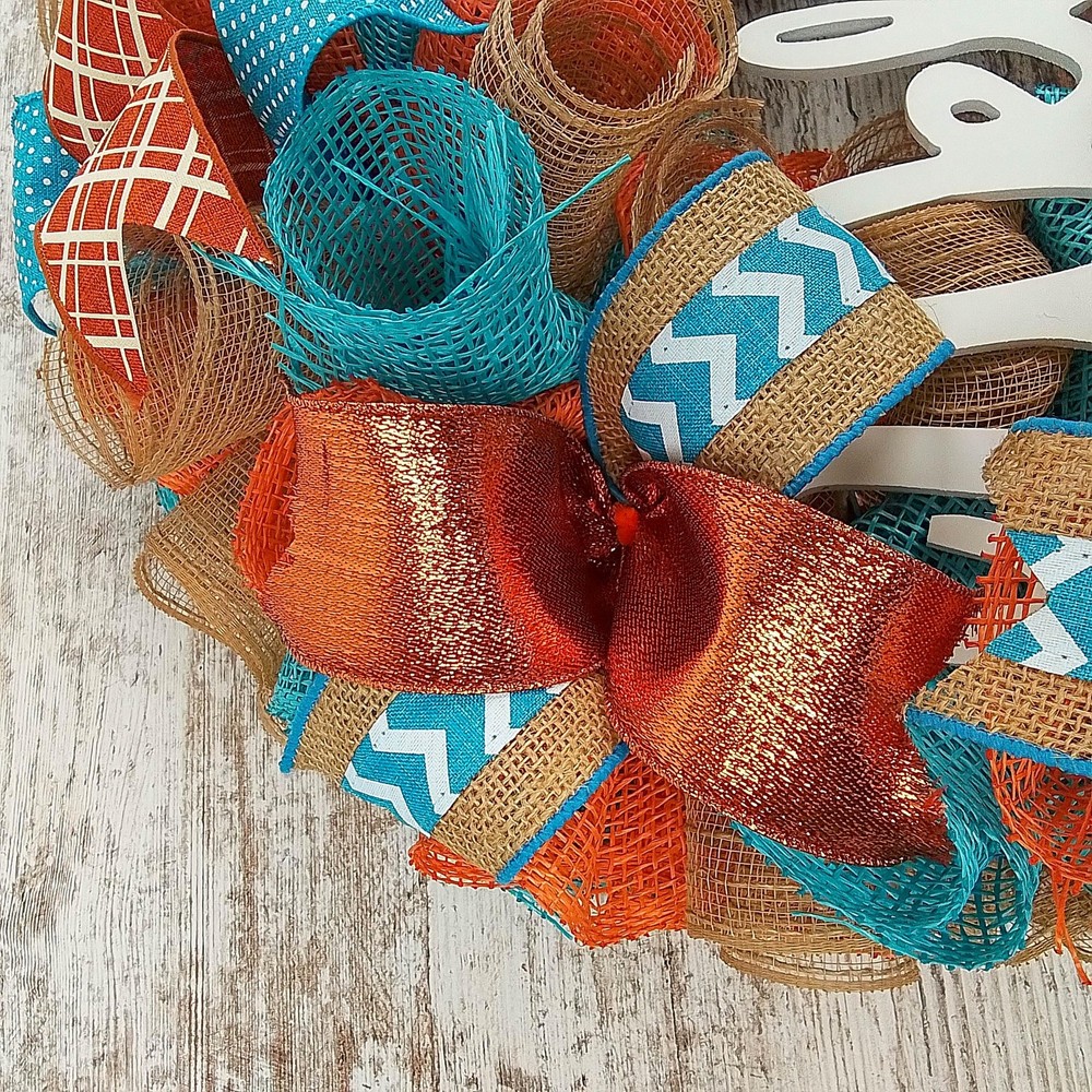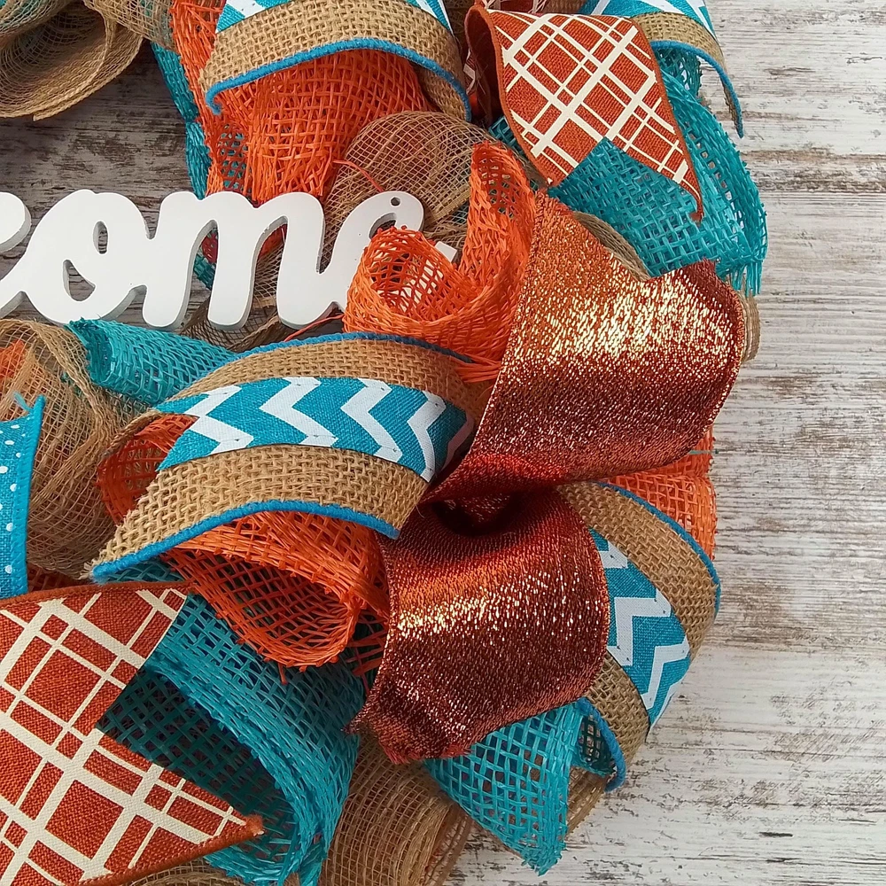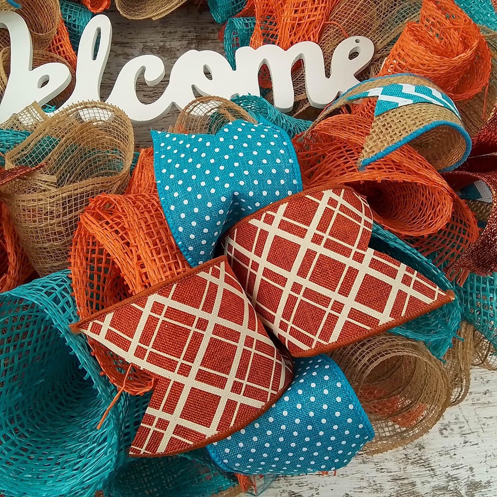 This inviting wreath will make a wonderful addition to your indoor or outdoor home décor. Use it for your own decor, or a gift for someone special. Thank you so much for visiting my shop and for considering pieces that allow my passion to make your home even more beautiful. Please message me with any questions before purchasing. This wreath measures approximately 24 inches round and approximately 5" deep. This ready to ship wreath is made with orange, turquoise and white mesh and accented with several different colors of ribbons to showcase the orange welcome sign in the center. Want something more custom or have questions? Send me a message...the backbone of my business is custom creations! Purchase with confidence in a seller with excellent reviews and over 15,000 sales between all selling venues. Indoor and outdoor pieces but my wreaths do appreciate a little shelter from the elements to stay in pristine condition.