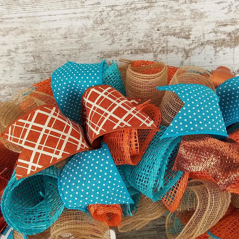 Product: Does not apply Weight: 4.0 Pounds Brand: Does not apply Type: Does not apply Style: Contemporary Material: Mesh, Deco Mesh, Wired Ribbon gtin13: Does not apply Package Dimensions LxWxH: 22.0x22.0x7.0 Inches Color: Orange, Turquoise, White UPC: Does not apply Size: Large